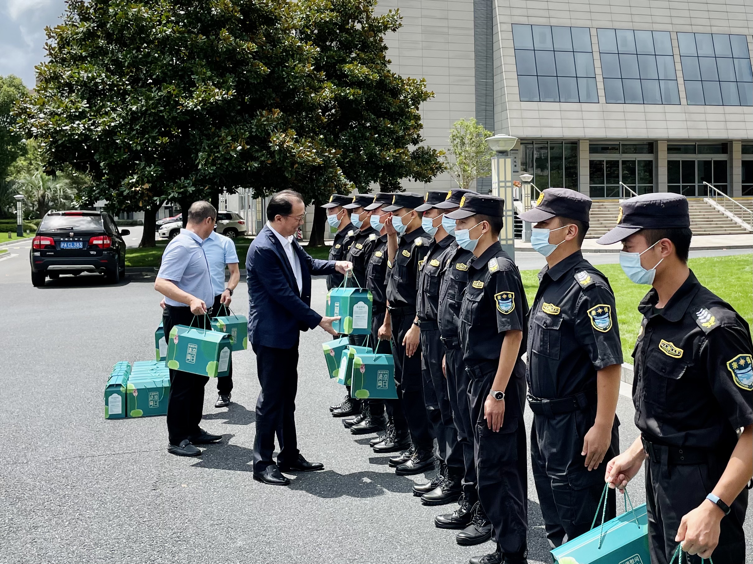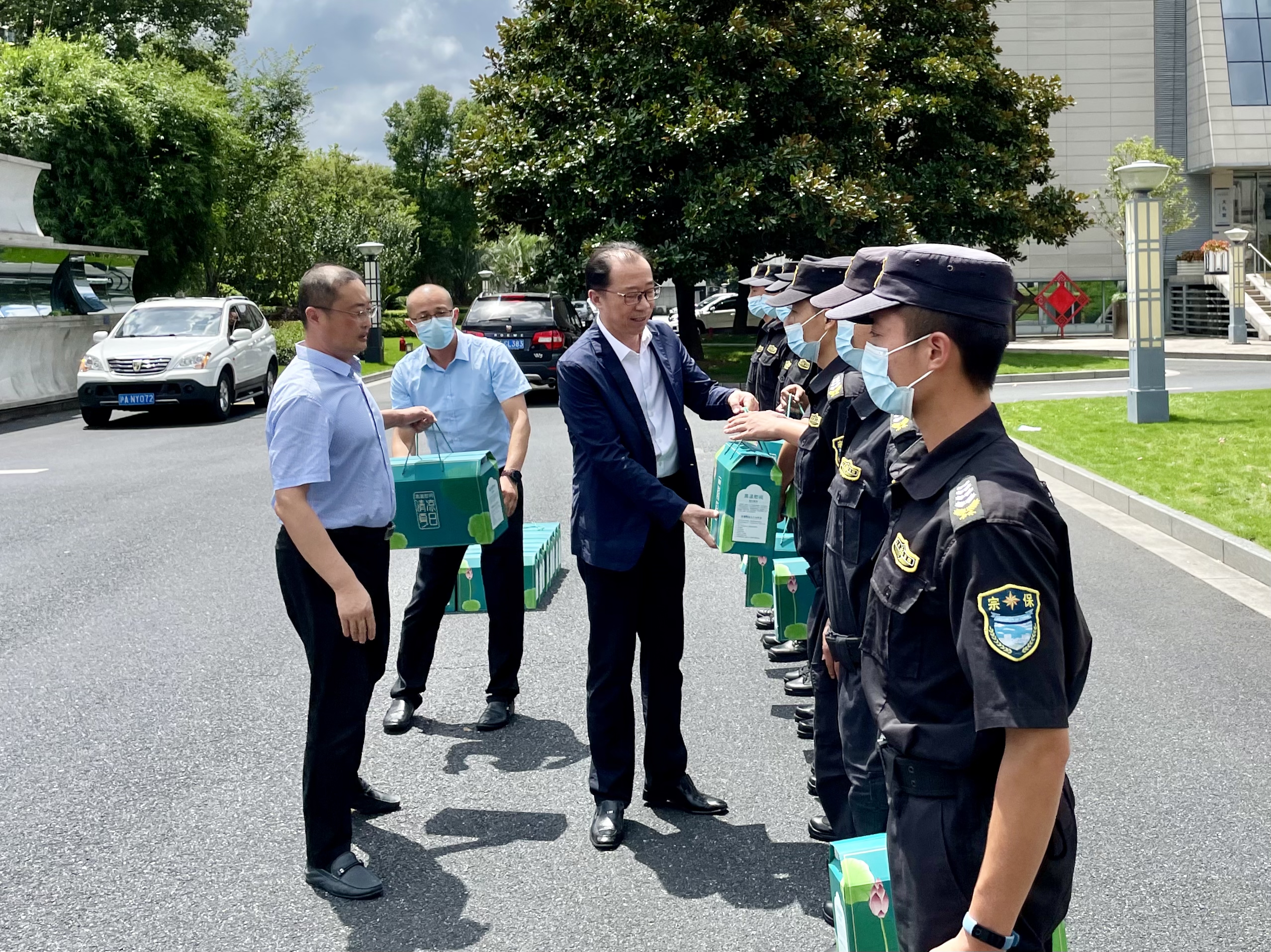 杨跃毅秘书长代表上海市保安服务行业协会,给队员们送上了防暑降温用品,对持续高温天气下,不畏酷暑、履职尽责,坚守岗位、敢于担当,依然坚守在户外值勤的宗保队员们给予充分肯定,叮嘱大家疫情防控要慎终如始不松懈,科学合理安排好休息,做好防暑降温工作,确保身体健康。