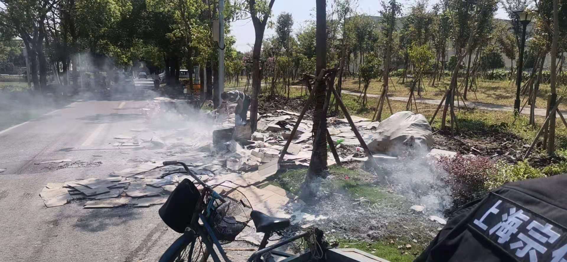 当日9:26,界浜村消防站队员在进行训练时,发现界浜村窑墩路上一辆行走的三轮车上的纸盒冒着黑烟,火苗直往上窜,而骑车的师傅没有察觉。在这危急时刻,4名队员马上停止训练,带上灭火器材奔到现场,迅速展开扑救。