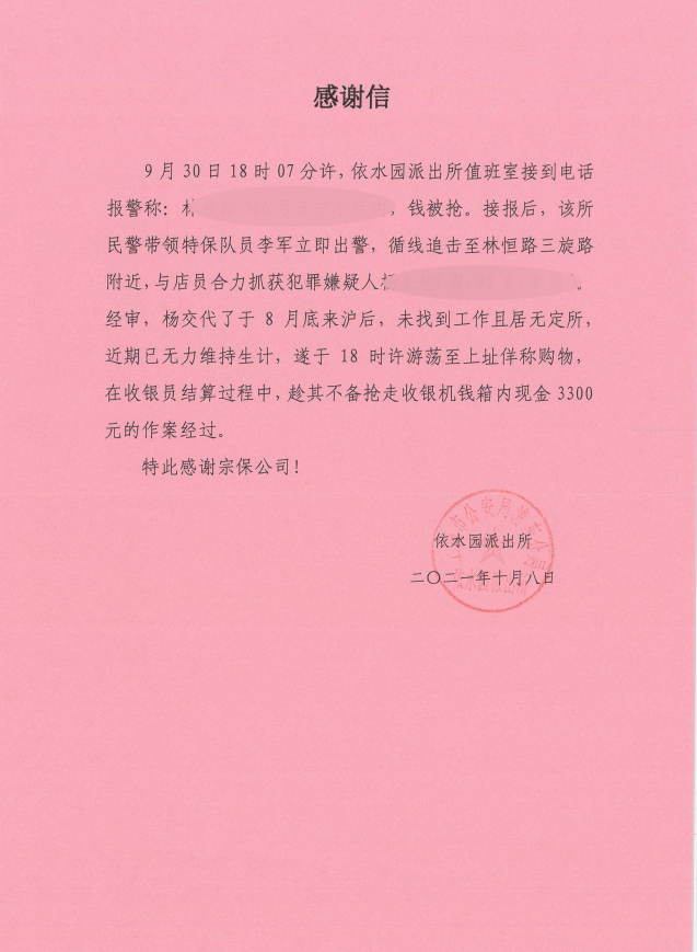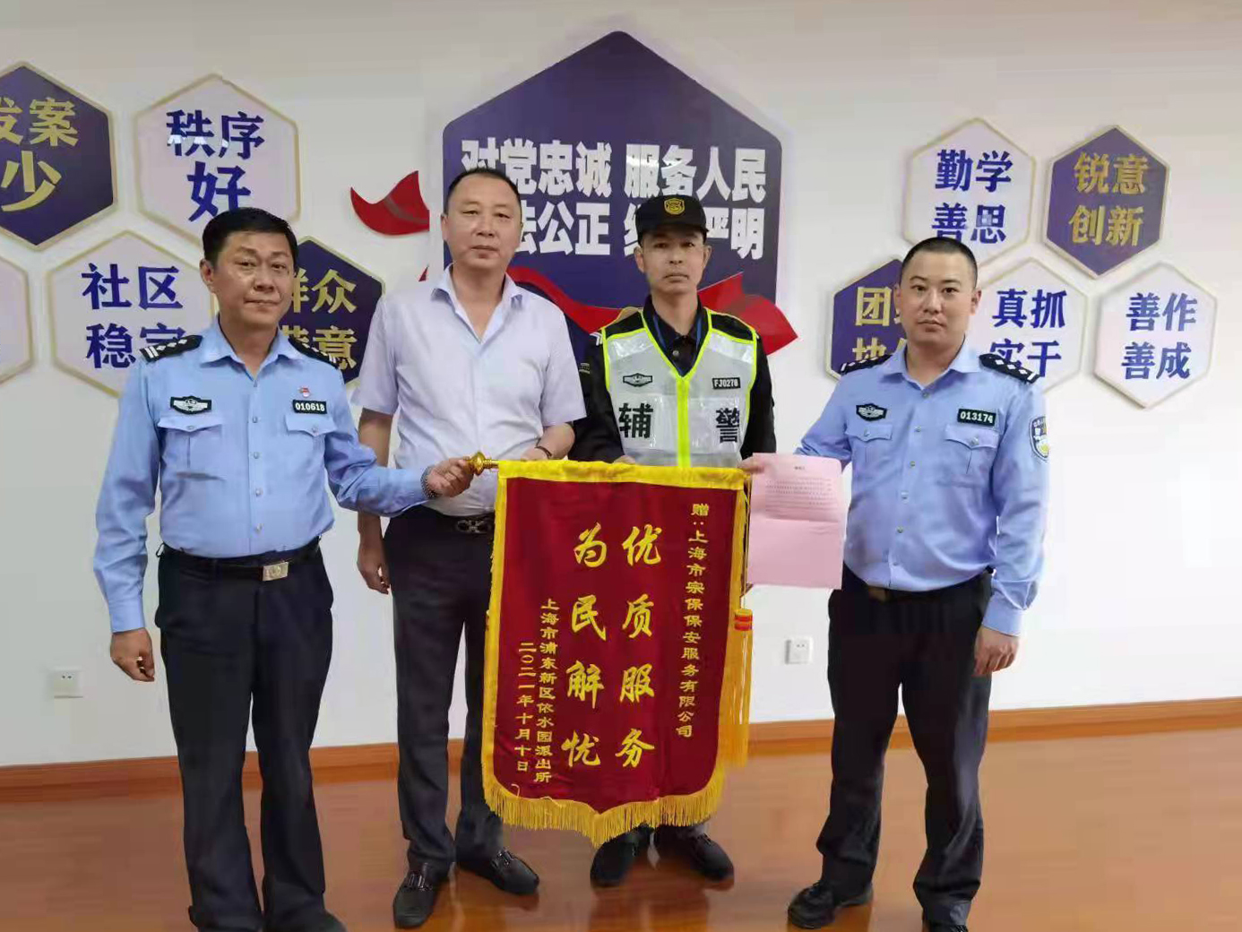10月15日,浦东新区依水园派出所副所长张啸天和民警钱坚强将一面绣有“优质服务 为民解忧”的锦旗和一封感谢信,送到宗保公司副总经理王耀和队员李军的手上,表扬宗保队员李军在抓获犯罪嫌疑人中机智果敢的行为。