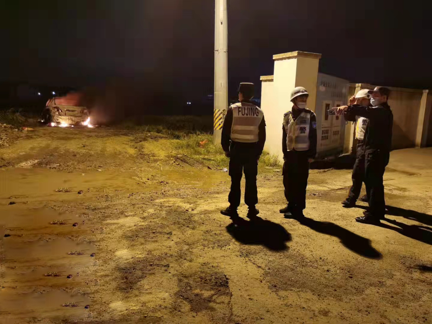 当日23:50,王崇、邵辉、潘祥海和班组长孙魁巡逻至沔北村558弄附近时,发现路边一辆现代牌轿车着火,现场冒着浓烟。