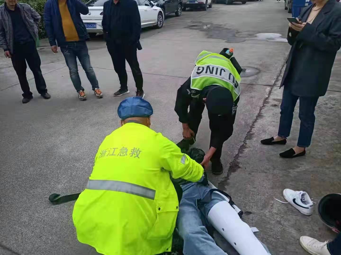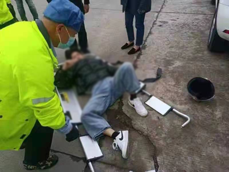 两名队员见状,立即跑上前察看。电瓶车车主受伤严重,身体无法动弹,脑部和左腿均有受伤。