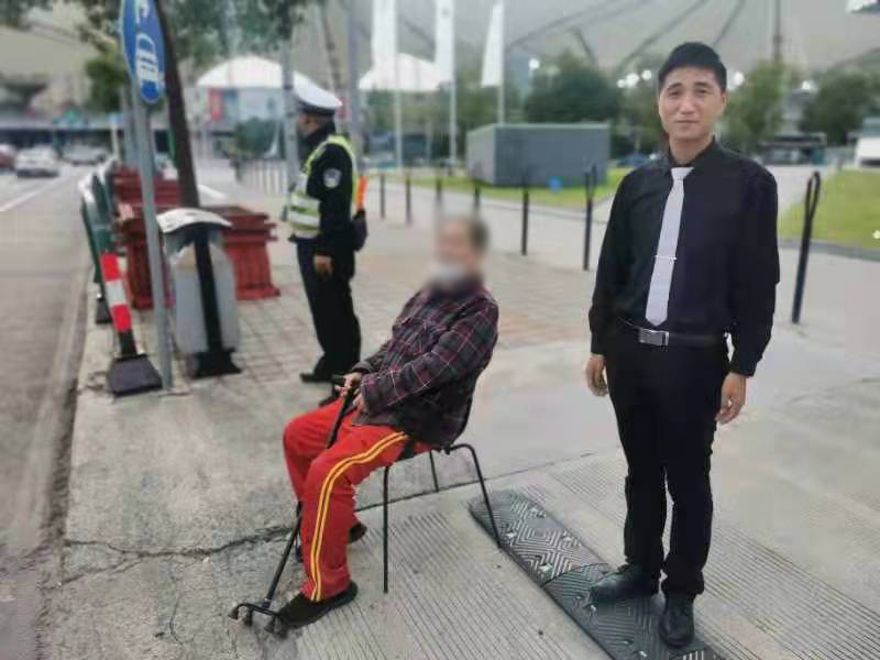 当天14:38,庞宝山在宝马馆门口值勤时,看到一位老先生一瘸一拐行走异常,便赶紧上前询问。老先生说自己脚疼得厉害,站不住。