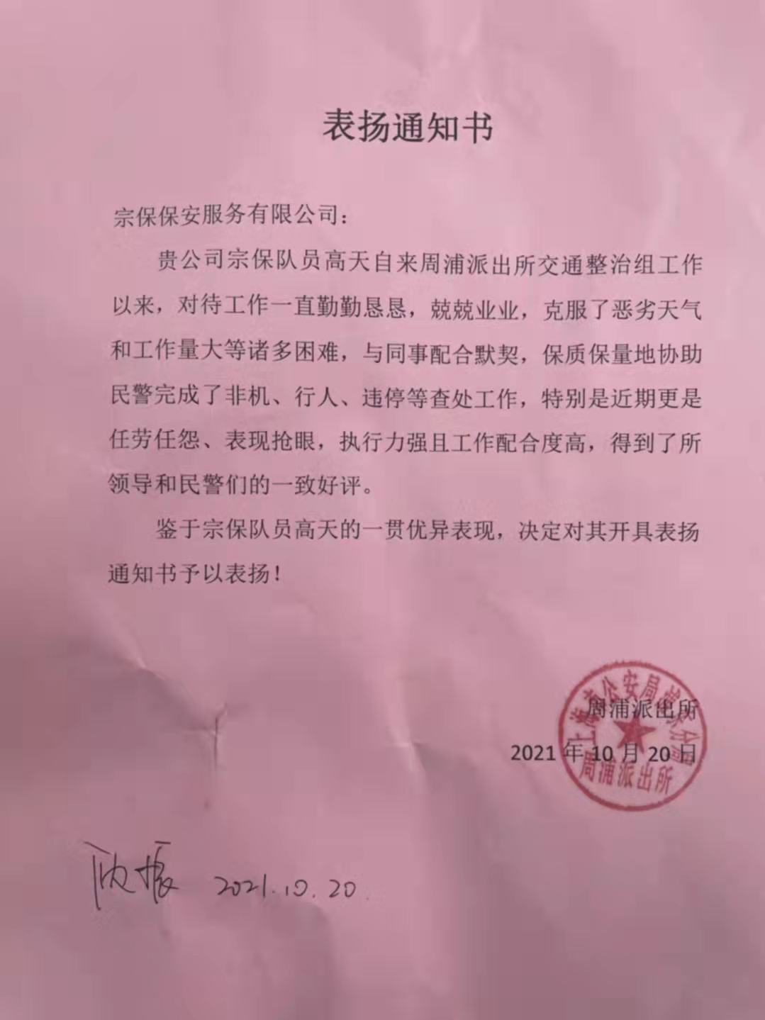 10月20日,宗保公司驻周浦派出所辅警项目收到周浦派出所送来的一封表扬信,信中对宗保队员高天在工作中忍辱克制、规范执法的行为提出表扬。