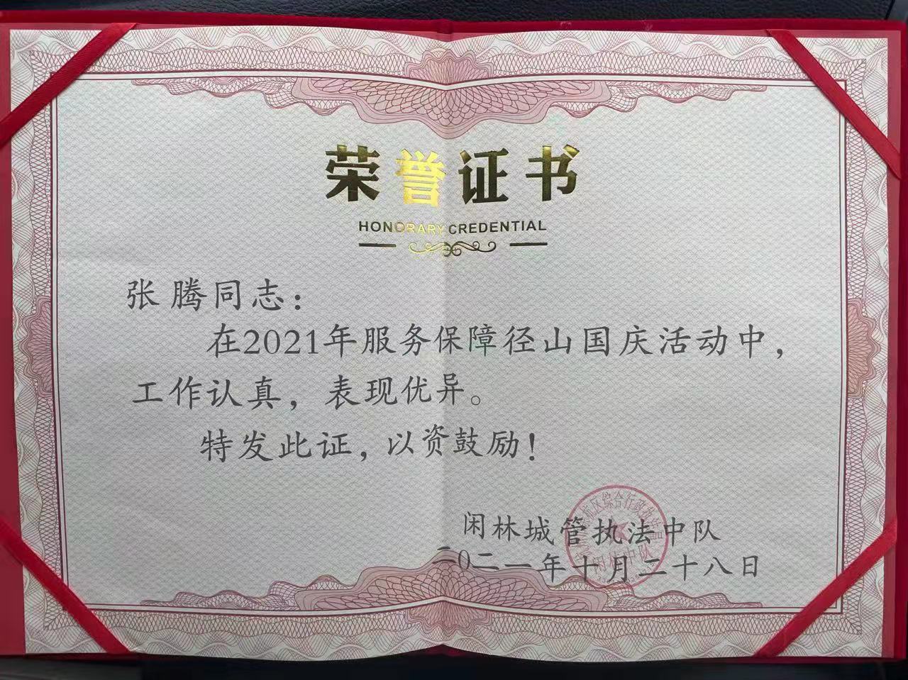 10月28日,浙江民泰驻闲林城管项目队员张腾收到闲林城管中队队长胡迪民送来的荣誉证书和慰问补助金,特别奖励他在2021年服务保障径山国庆活动中勇救溺水女孩的行为。
