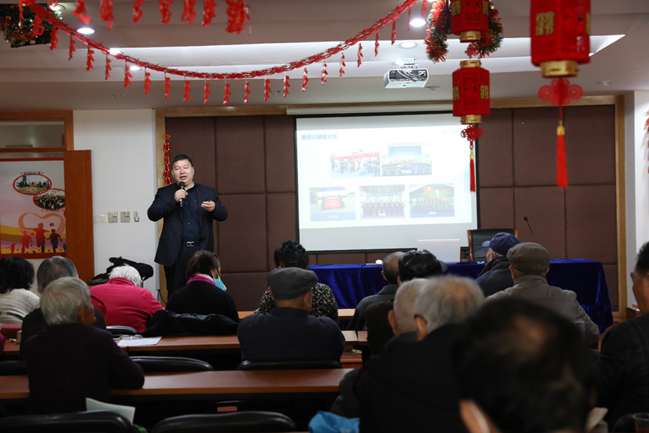 杨璞副总经理首先代表公司创始人冯中保感谢离退休老干部对公司发展的关注关心和支持,并采用图文并茂的方式,从公司坚持党建引领,保持正确的经营发展方向、严格内部管理提升服务保障能力、主动承担社会责任打造向上向善企业文化三个方面详细介绍了公司参与市域社会治理辅助、业务拓展发展等情况。