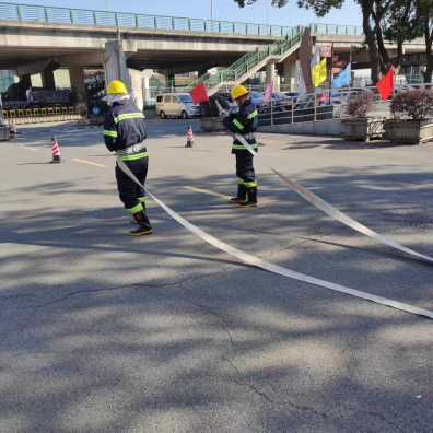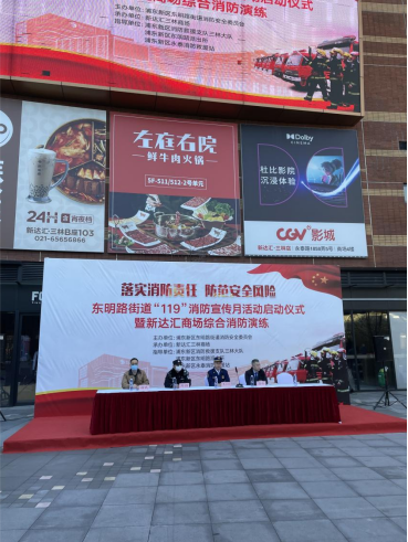 东明街道微型消防站队员们参加东明街道“119”消防宣传月启动活动仪式暨新达汇商场综合消防演练的活动。