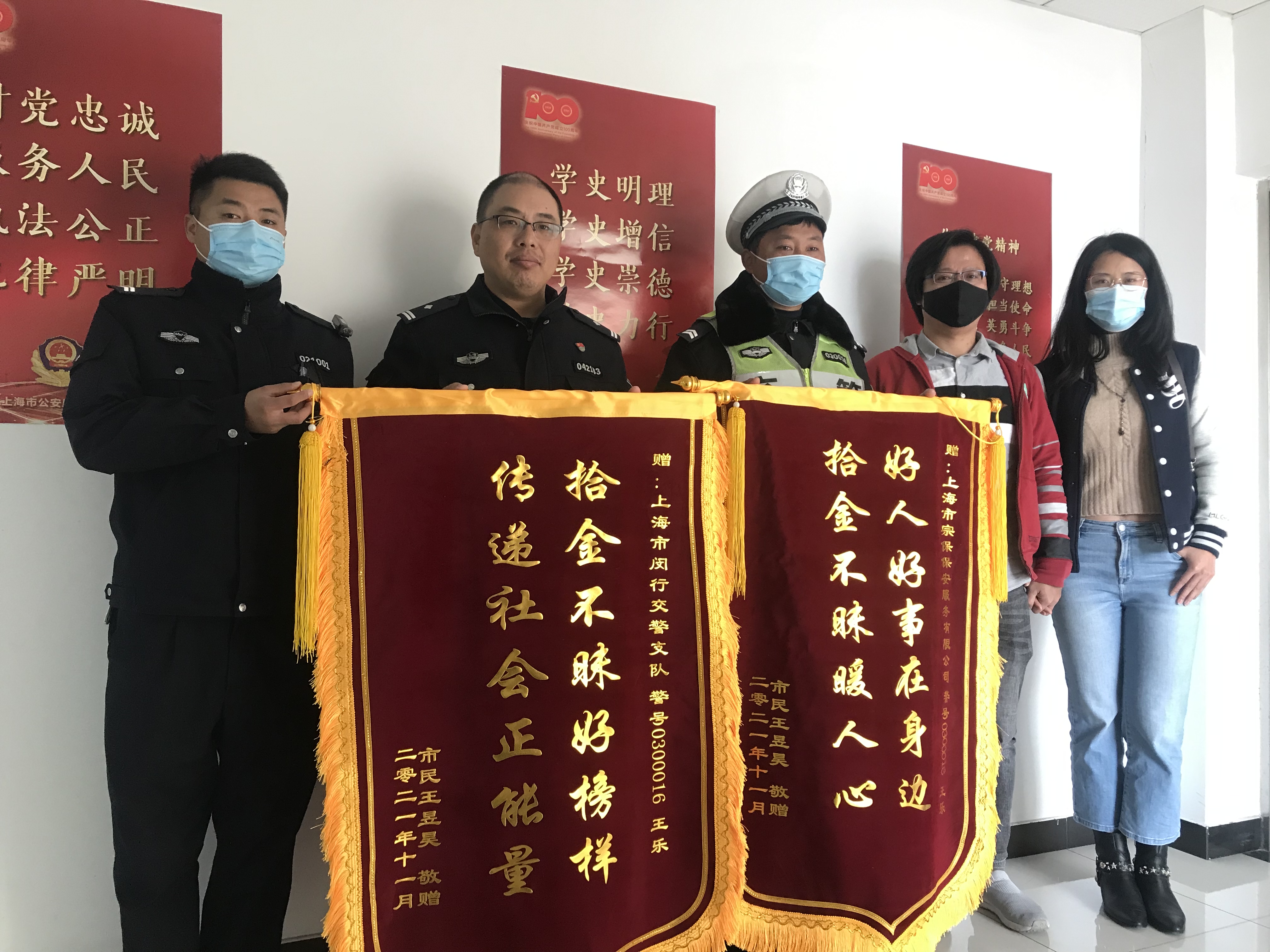 12月1日,宗保公司驻闵行交通委项目队员王乐收到市民王先生送来的绣有“拾金不昧好榜样 传递社会正能量”“好人好事在身边 拾金不昧暖人心”的锦旗,称赞他拾金不昧的行为。