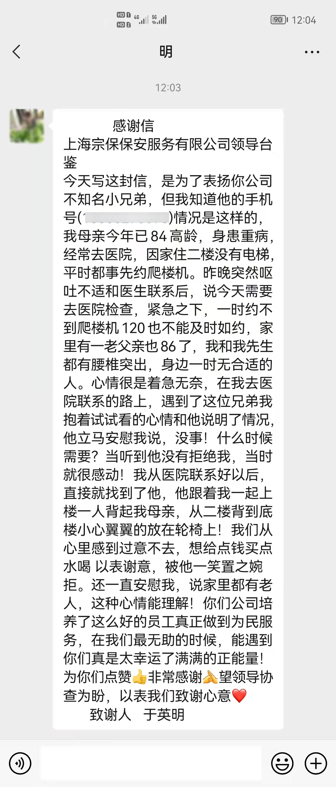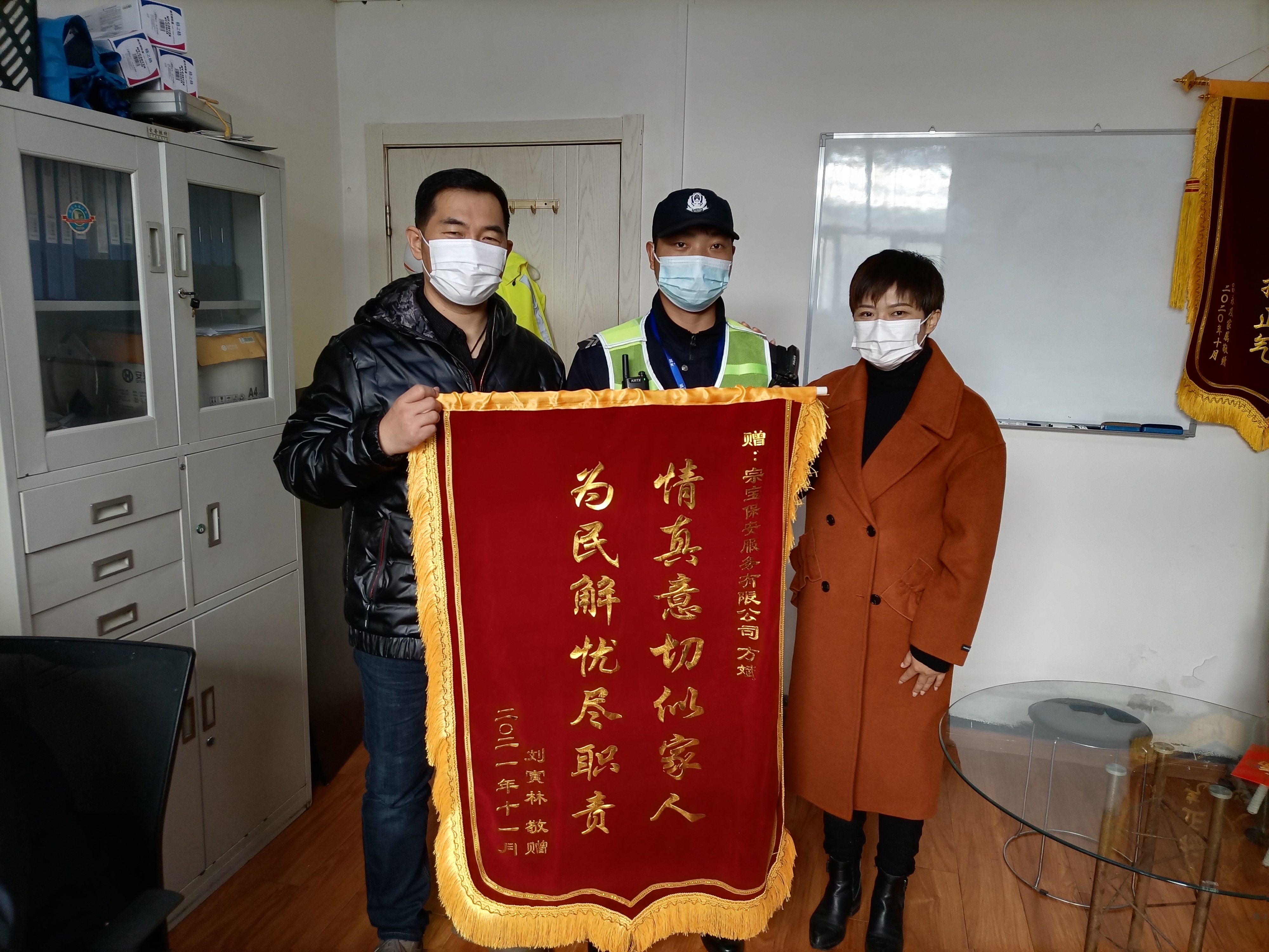 11月28日,宗保公司驻闵行莘庄梅陇辅警项目收到市民刘女士送来的一面绣有“为民解忧尽职责 情真意切似家人”的锦旗和一封感谢信,感谢队员方斌热心助人的行为。