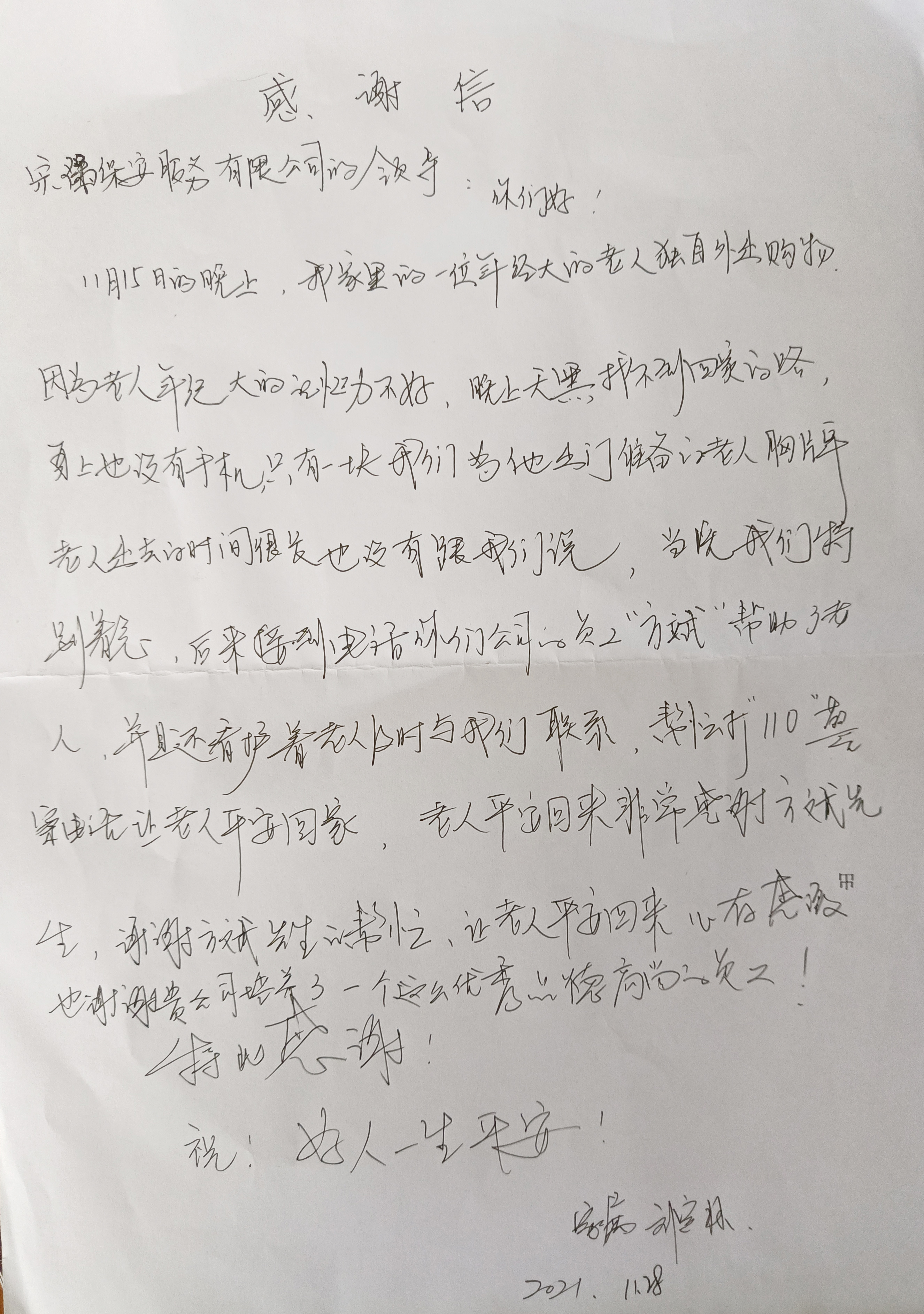 很快,民警赶到现场,联系了老人的家属并将其送回家中。事后,老人家属得知详情,对宗保公司员工热心助人的行为十分感谢,特意送来锦旗和感谢信以表达家人的感激之情。