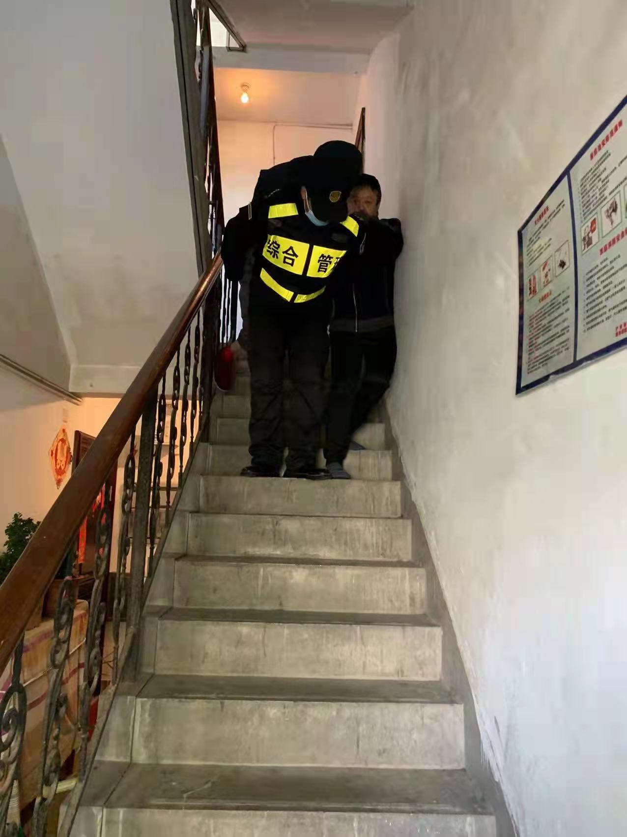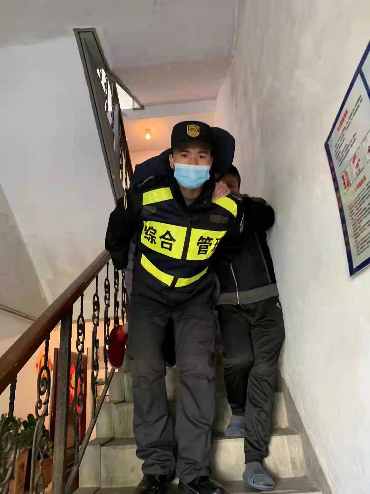 老人看病下楼难 队员背着暖人心—沪东市容项目队员背老人下楼看病