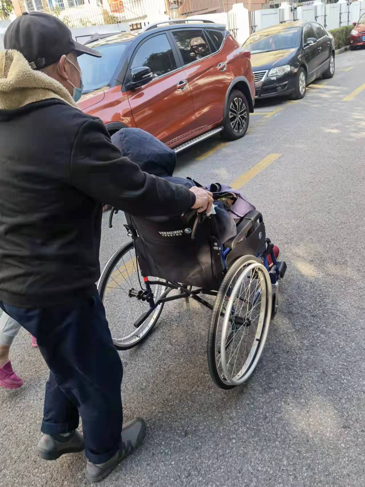 老人年纪大,又有一定的体重,为了避免发生意外,范大才背着老人格外小心,不敢过于直起腰,生怕老人从背上滑下来,所以小心翼翼地,一步一步慢慢地往下走。来到楼下,范大才轻轻地将老人放到轮椅上,并叮嘱于阿姨抓紧时间带老人去医院就医。
