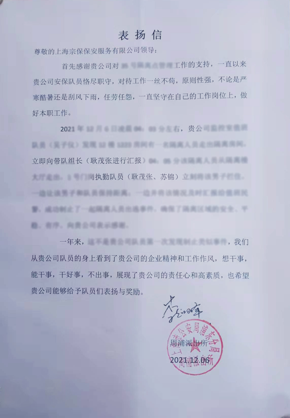 12月6日,宗保公司收到周浦派出所的表扬信,信中对宗保员工恪尽职守、认真细致的工作表现提出表扬。