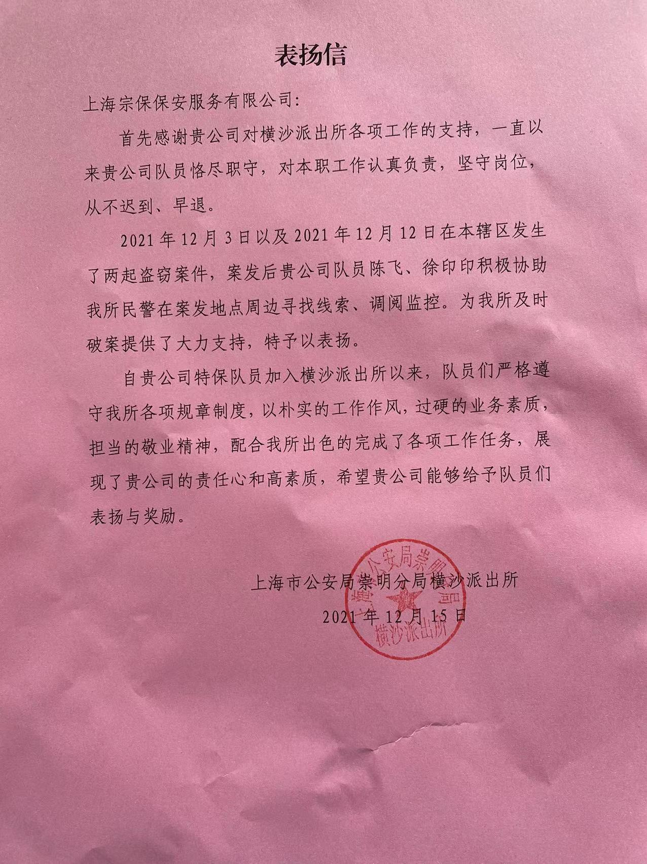12月15日,宗保公司驻崇明区横沙乡项目收到崇明区公安分局横沙派出所的表扬信,表扬恪尽职守、工作负责的宗保队员。
