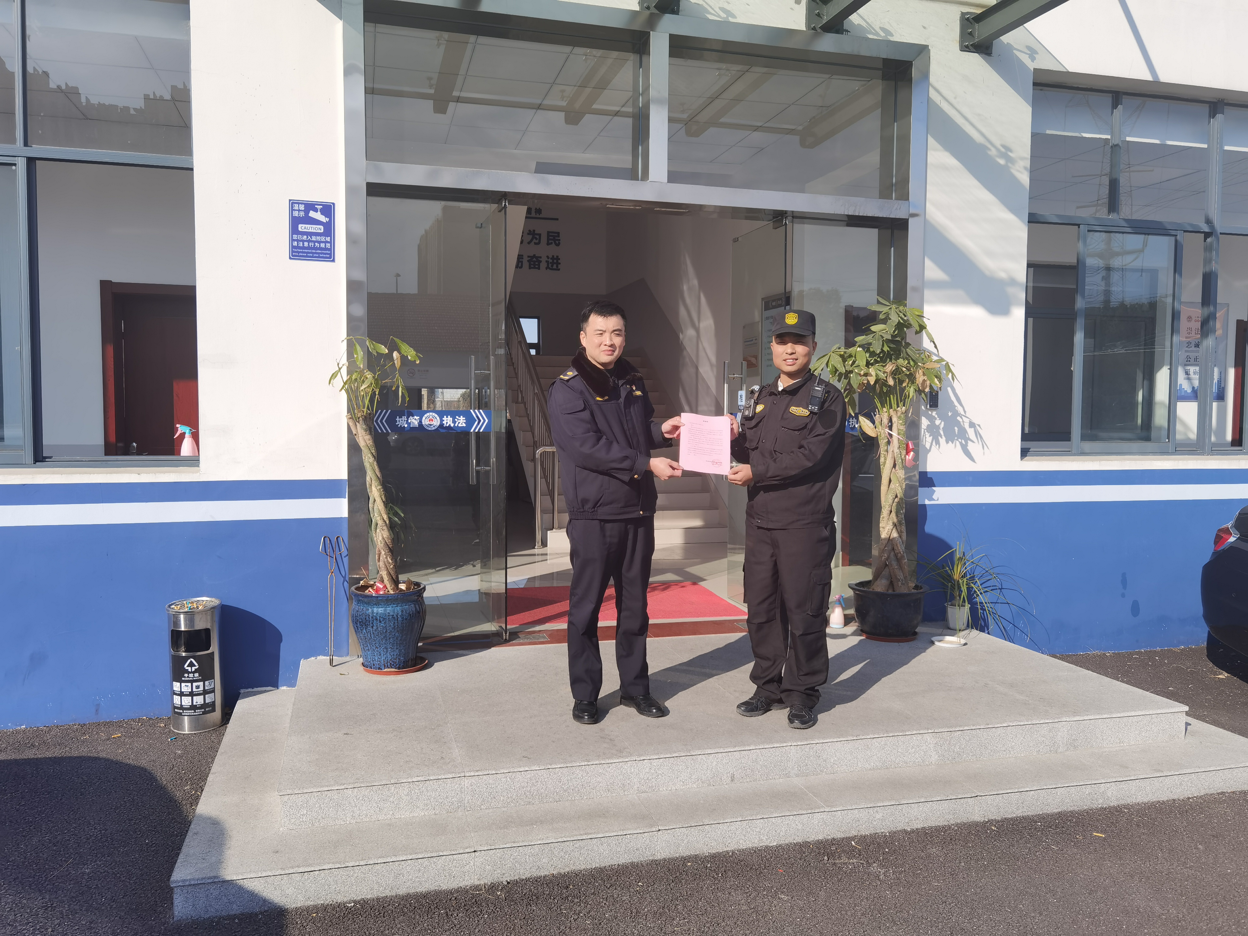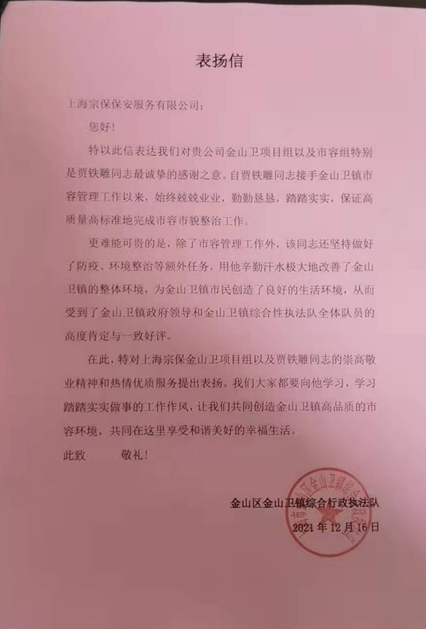 12月16日,宗保公司驻金山卫市容项目收到金山卫镇综合行政执法队的表扬信,信中对宗保队员贾铁雕兢兢业业的工作表现提出特别表扬。