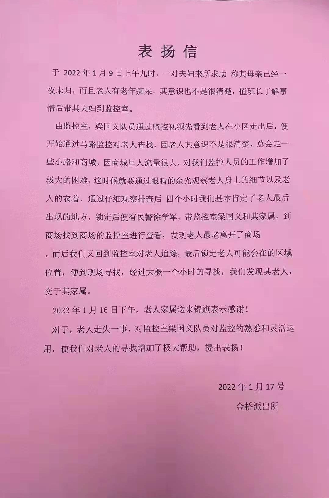 老人走失家人急 协力寻找暖人心—金桥辅警项目收到锦旗和表扬信