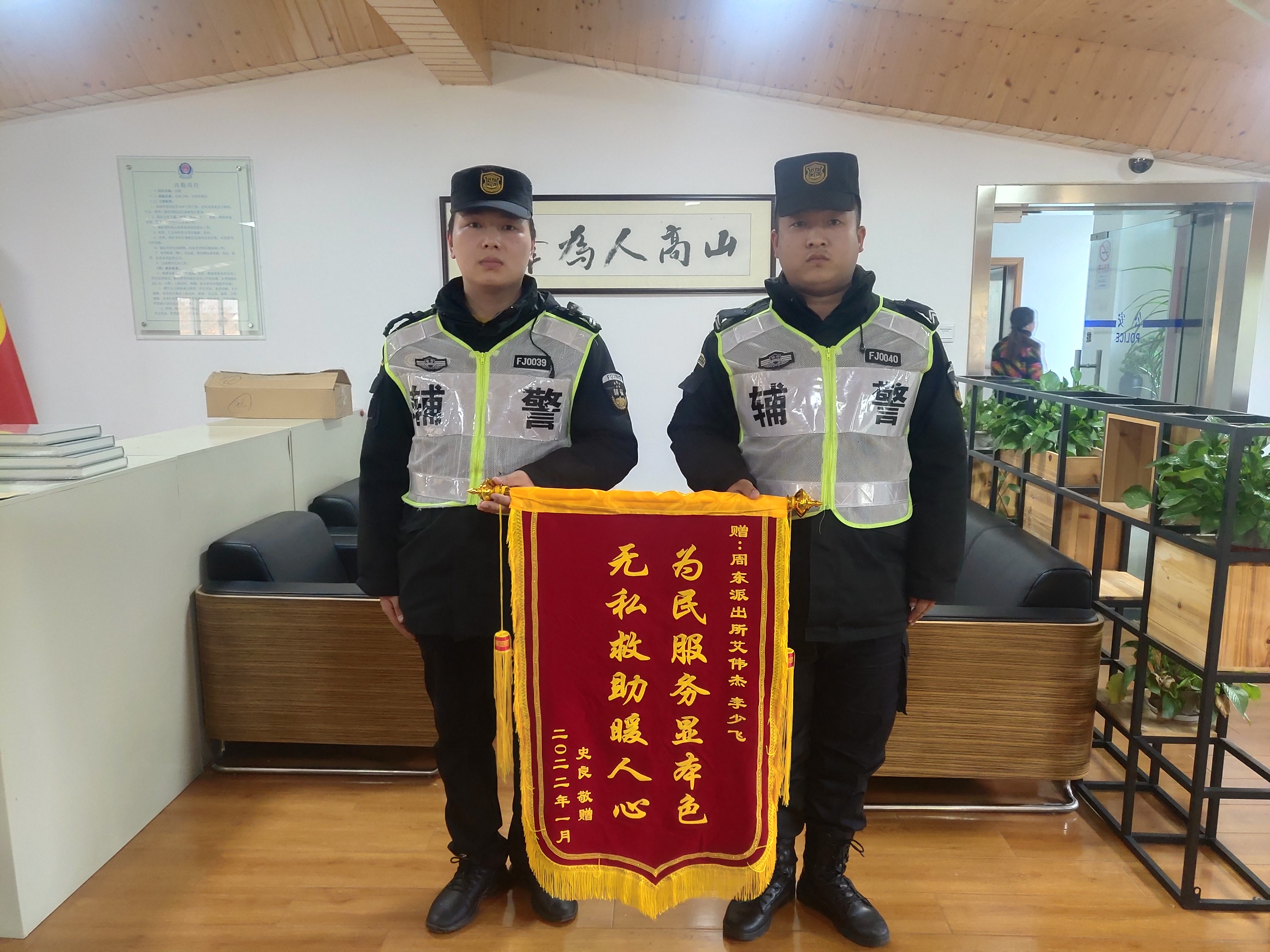 1月12日,宗保公司驻周东辅警项目队员艾伟杰和李少飞收到一面绣有“为民服务显本色 无私救助暖人心”的锦旗。