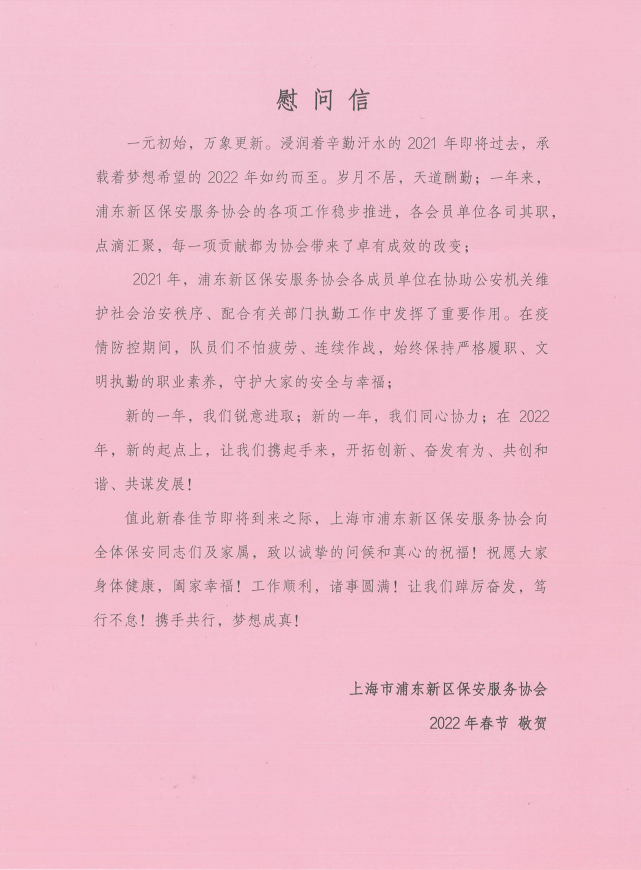 协会领导的关怀,宗保员工们备受鼓舞。大家表示,将继续发扬吃苦耐劳、乐于奉献的精神,认真履职、文明值勤,全力配合做好甲方赋予的各项工作任务,努力为浦东新区平安建设作出应有的贡献。
