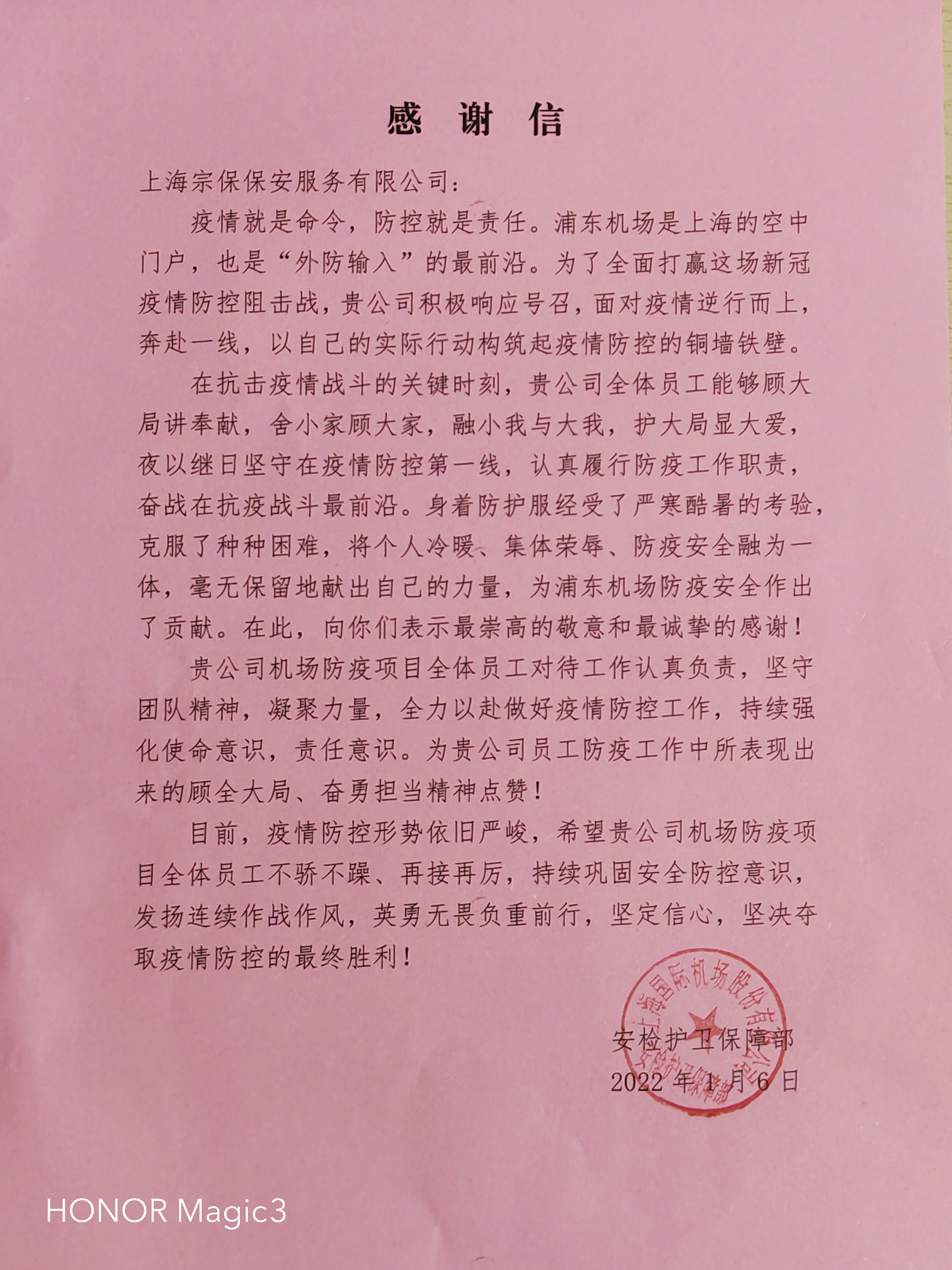 机场股份公司安检护卫保障部赠送锦旗是对宗保公司驻机场防疫项目全体员工所做工作的肯定,不仅仅是荣誉和鼓励,更是鞭策和责任。公司将继续发扬主动作为、奉献担当的作风,践行不惧风险、勇毅前行的精神,增强携手共进、履责于行的协同意识,与甲方一道共同筑好浦东机场疫情防控铜墙铁壁,为全力保障市民健康安全作出新贡献。