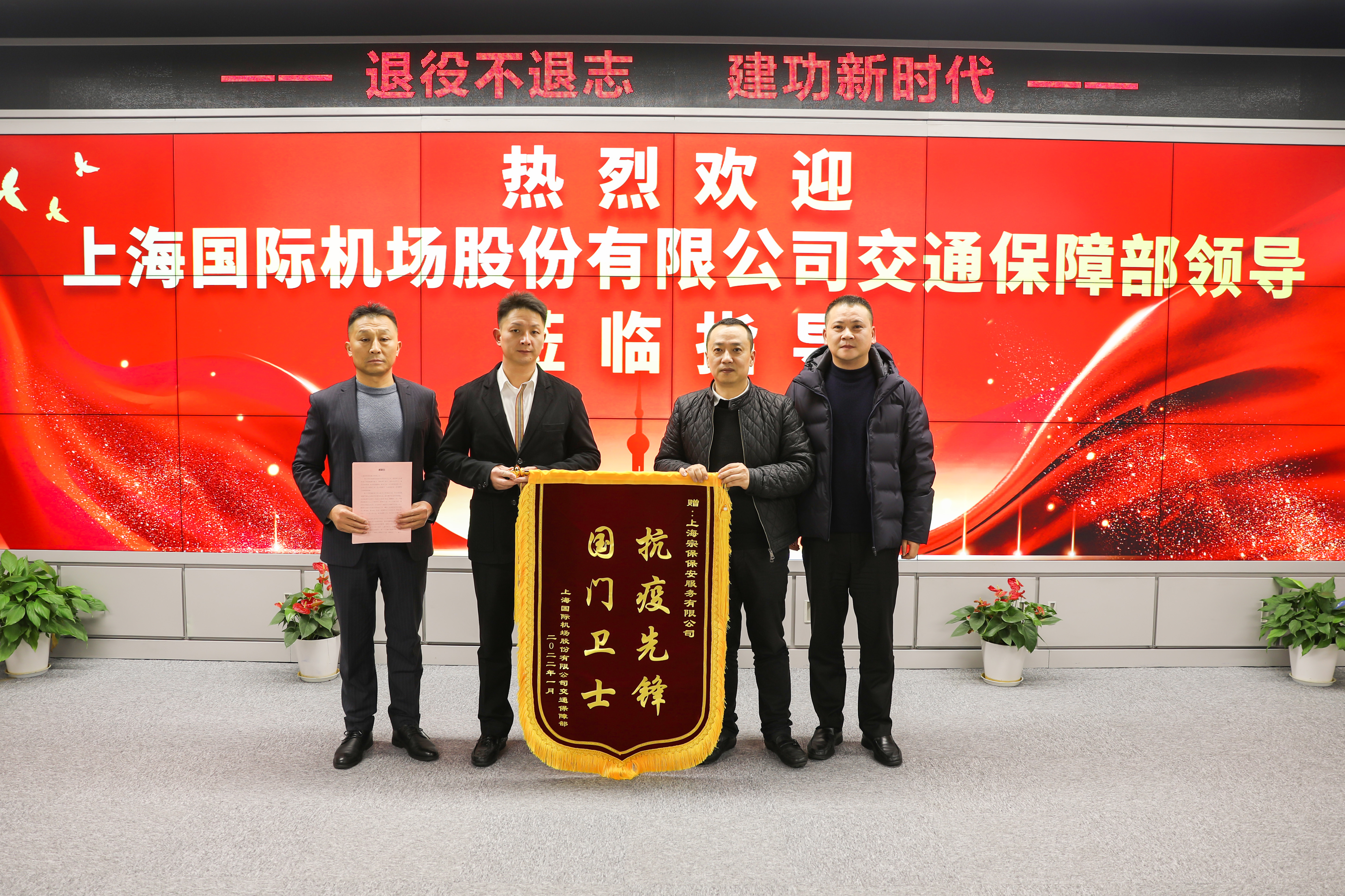 1月25日上午,上海国际机场股份有限公司安检护卫保障部党委书记鲍飞荣、纪委书记陈长波将一面绣有“防疫一线勇挑重担当尖兵 守护空港忠诚履职保平安”的锦旗送到宗保公司,感谢公司对浦东机场防疫工作的大力支持和突出表现。
