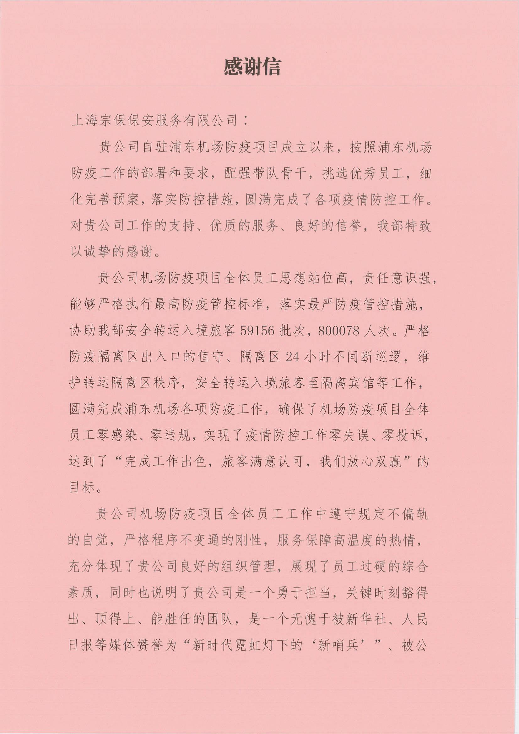 一面锦旗、一封感谢信,是对宗保公司员工机场防疫工作的充分肯定。宗保公司将不辜负机场股份公司的期望,坚持以守土有责的担当情怀,以不怕吃苦的奉献精神,以严谨细致的工作作风,助力守牢机场口岸防疫“第一关口”,坚决配合好机场股份公司交通保障部筑起一道疫情防控的坚实屏障。