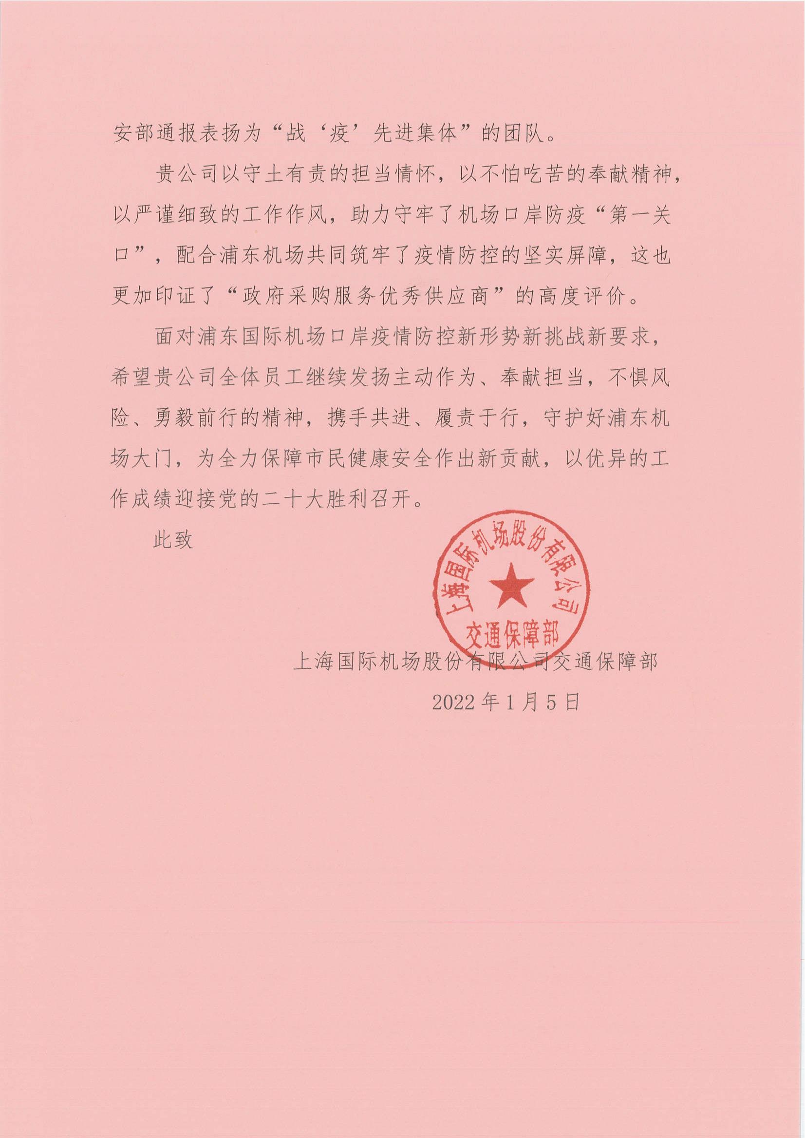—上海国际机场股份有限公司交通保障部送来锦旗和感谢信