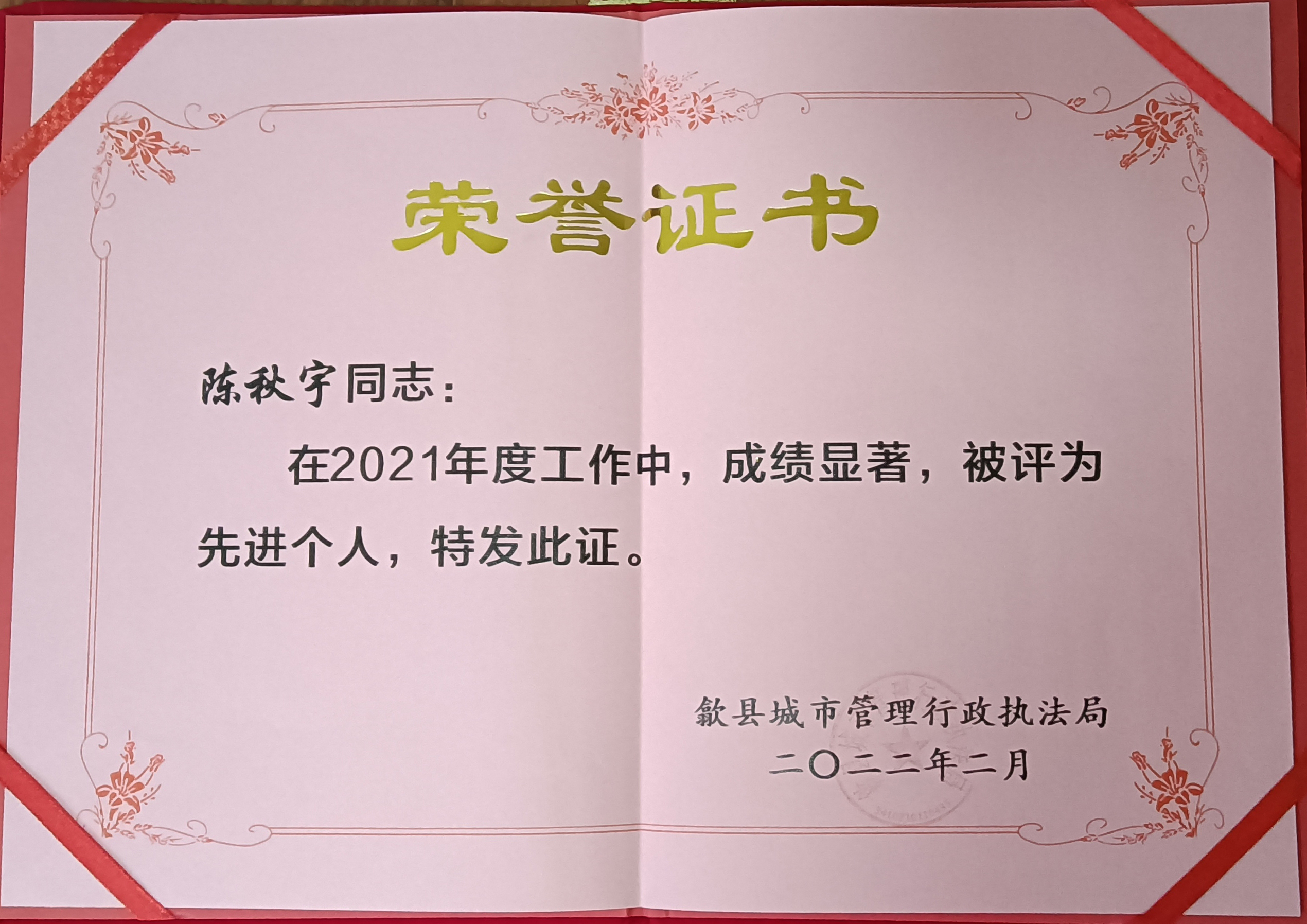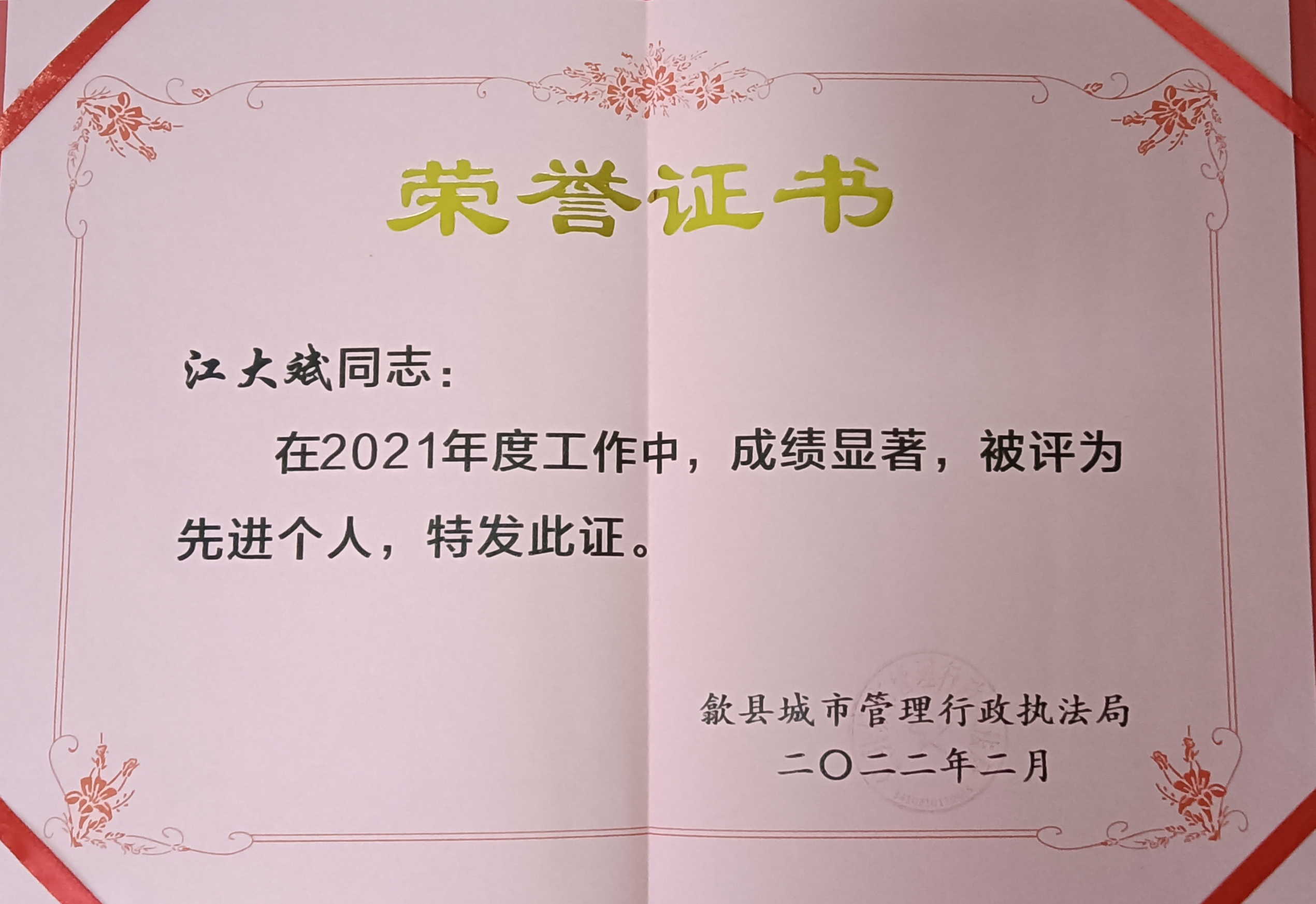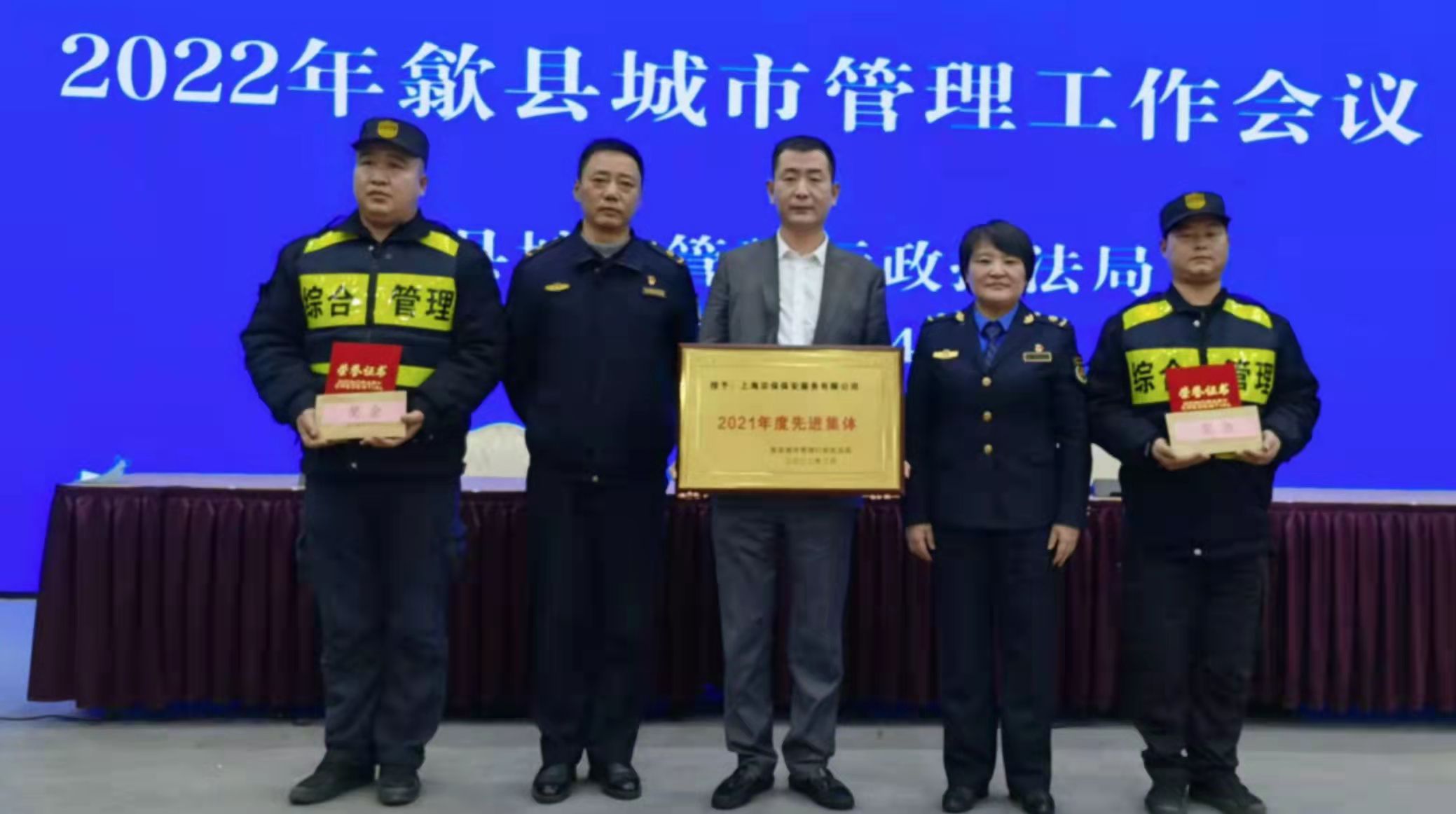 2022年2月14日,歙县城管执法局召开城市管理工作会议。公司驻歙县市容项目队被歙县城市管理行政执法局评为“2021年度先进集体”,项目队员江大斌、陈秋雨被评为“先进个人”。
