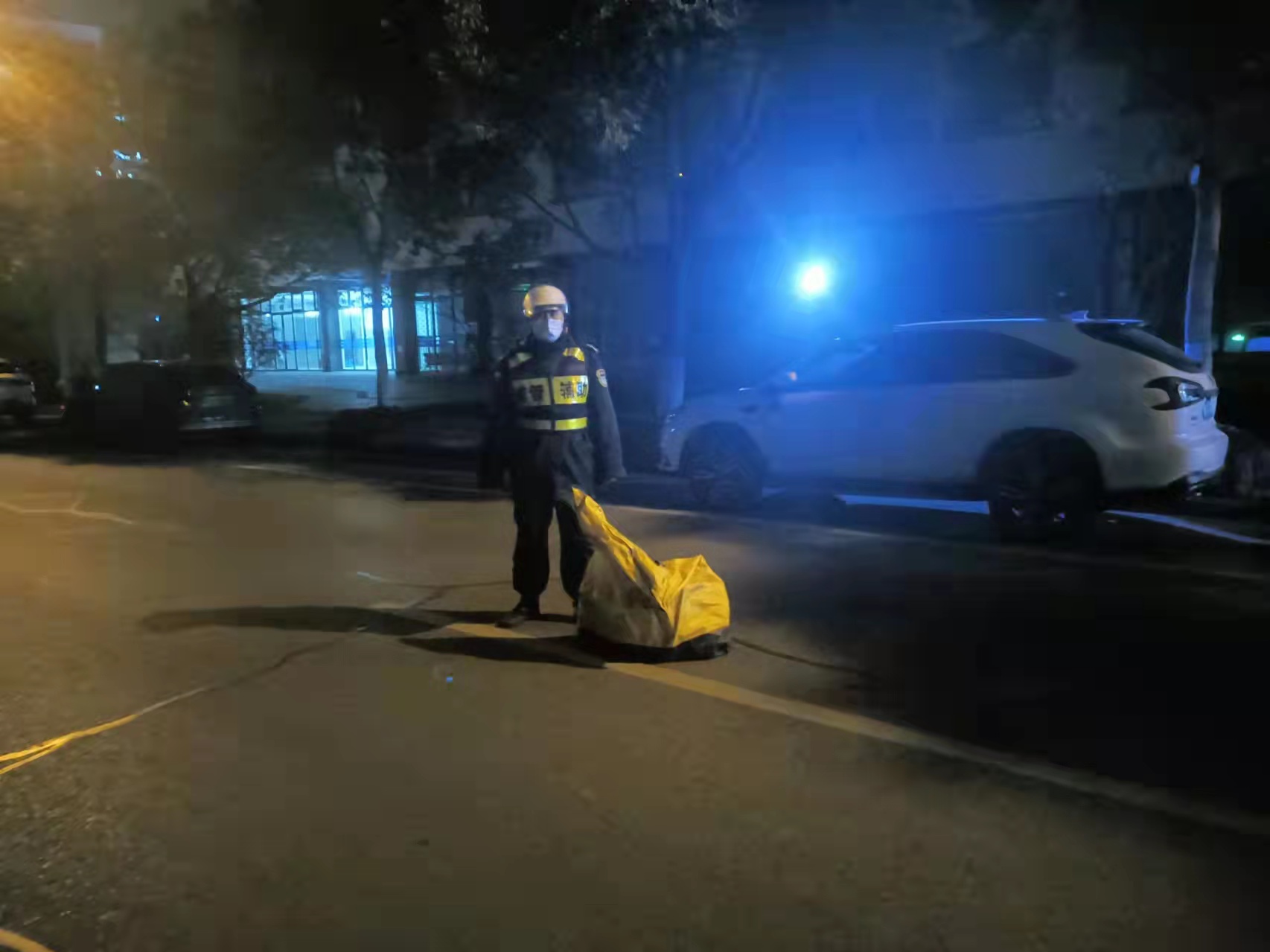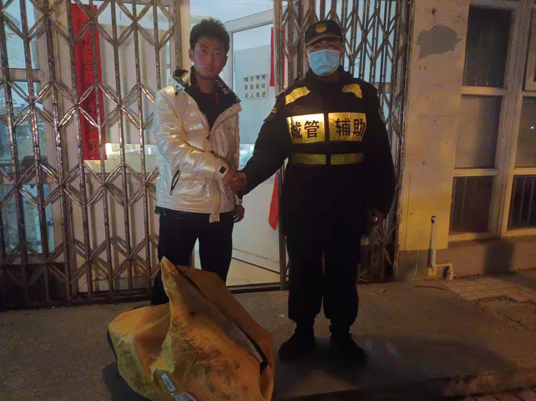 3月9日18:30,徐东阳在御霞路草和谷生鲜集市门口巡逻时,发现有一袋物品掉落在路中间,便立即上前查看,原来是一袋中通快递包裹。徐东阳立即将情况上报队长,并按指示在原地等待。