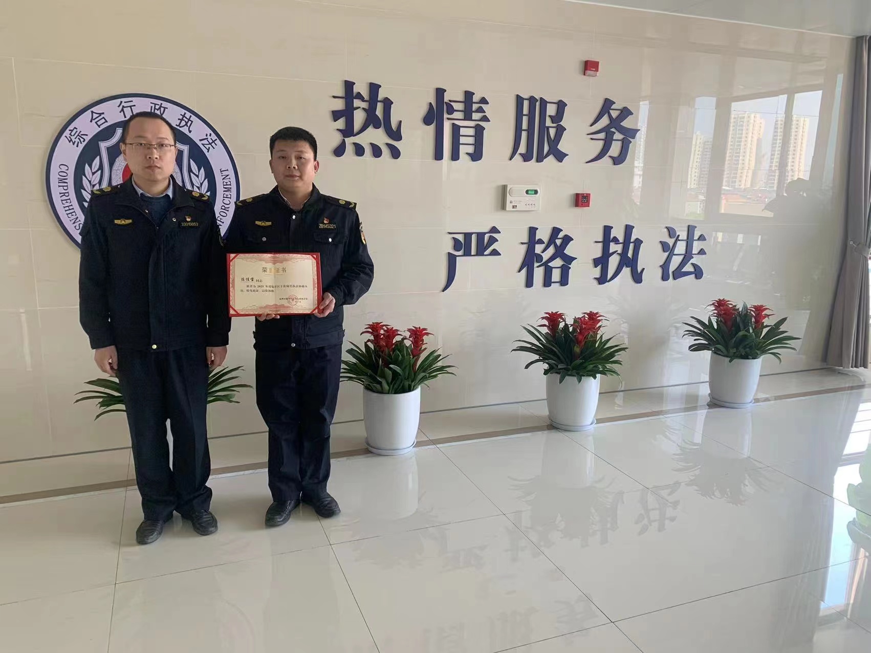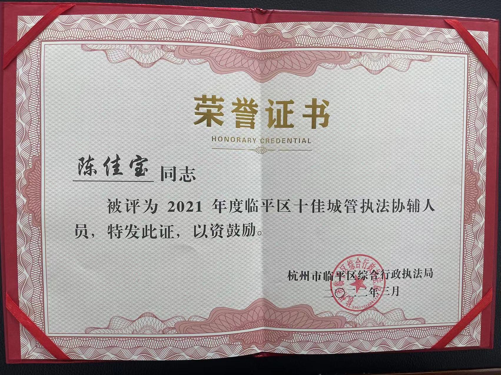 3月9日,杭州市临平区星桥街道城管中队领导将一本荣誉证书送到浙江民泰队员陈佳宝的手中,祝贺他荣获“2021年度临平区十佳城管执法辅助人员”。