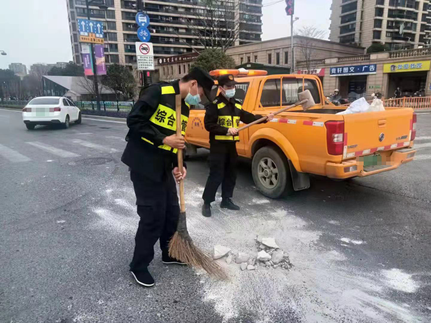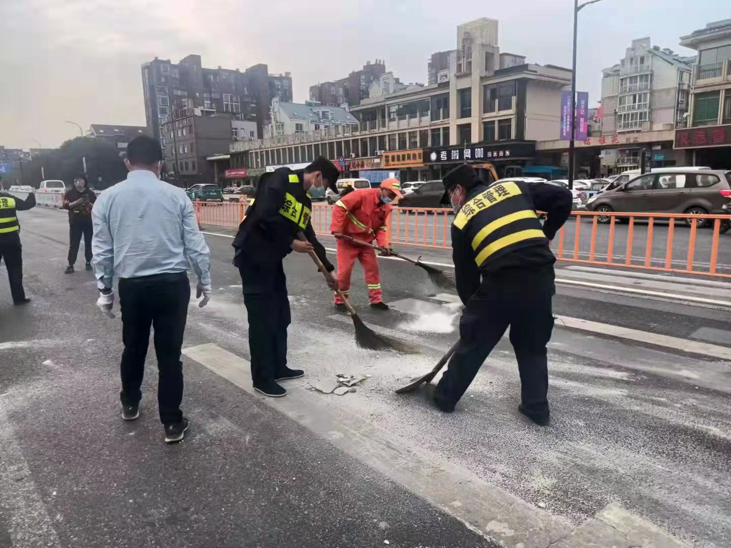 见此情形,大家赶紧上前,杨培发引导路过车辆减速慢行,其他队员与随后赶到现场的保洁员一起进行清理。经过20多分钟的努力,路面很快被清扫干净,道路恢复了通畅,此举赢得了过往市民群众的称赞。