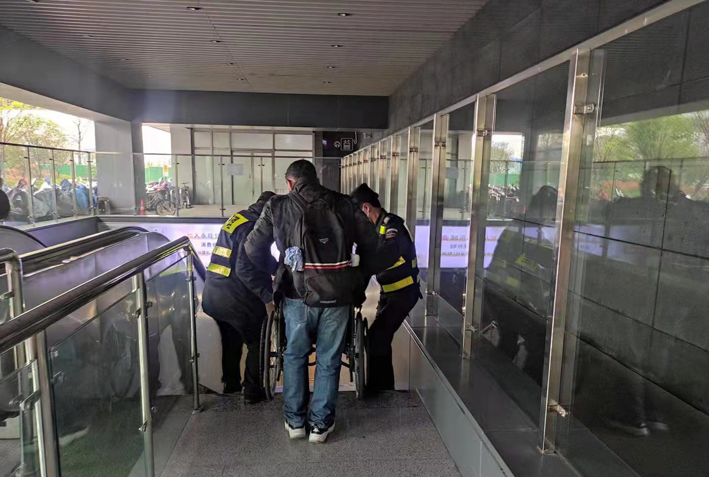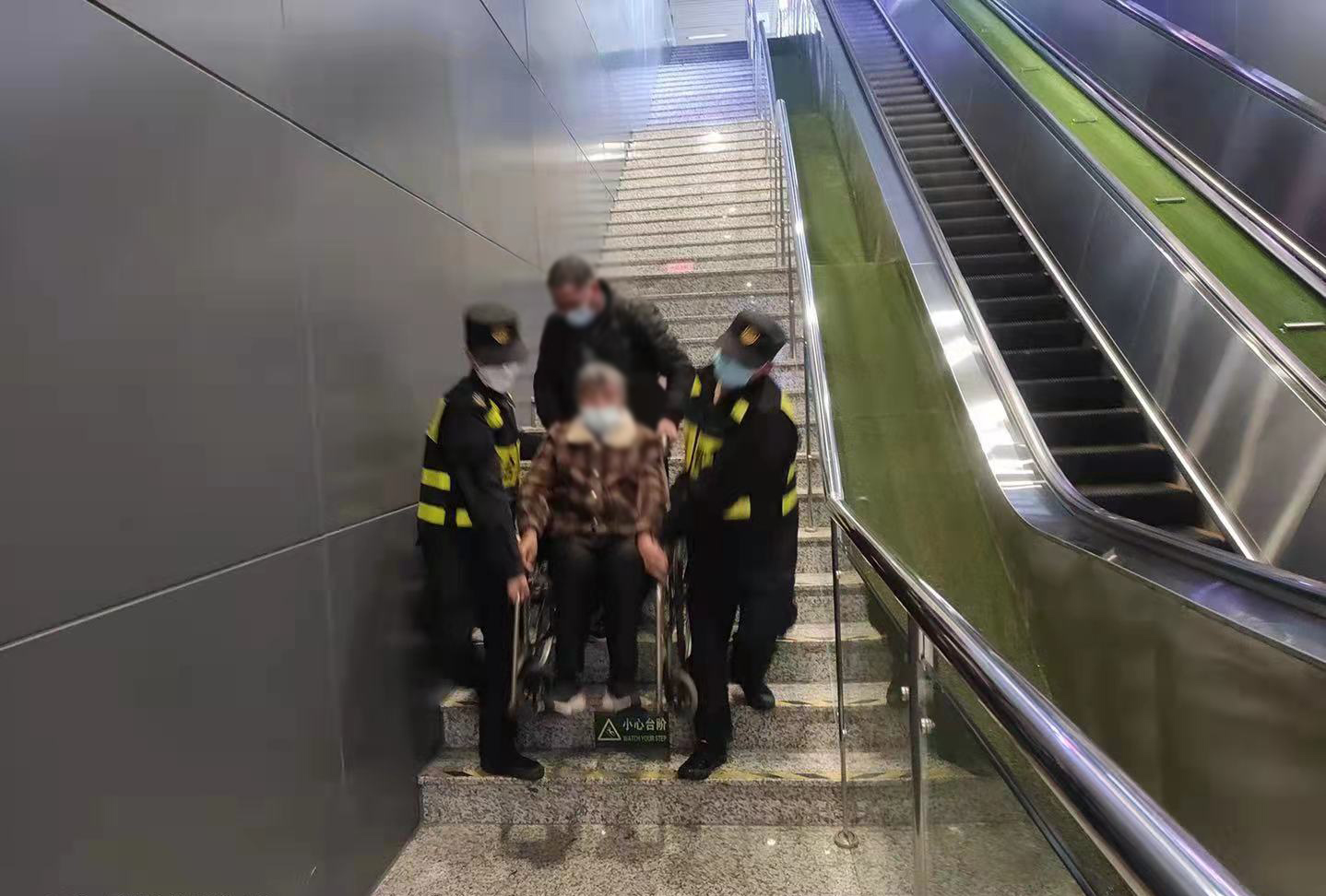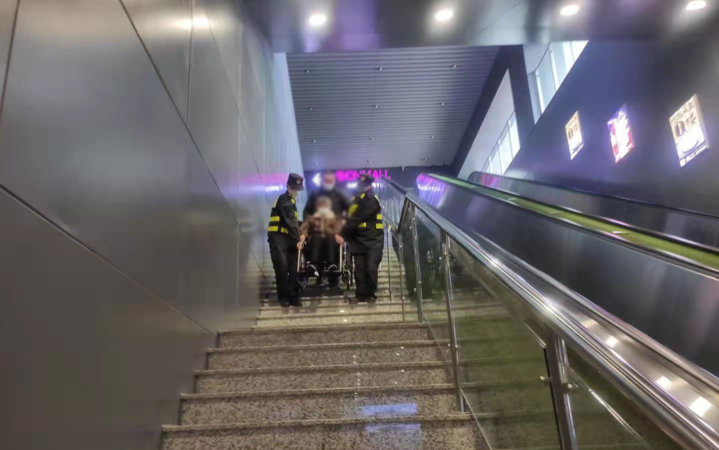 张彬洋和樊粤强主动帮忙将老人抬下楼梯。因楼梯陡长,两人抬起轮椅时格外小心,不敢直起腰,生怕老人从轮椅上滑下来,直至将老人安全地抬下楼梯,送到了地铁候车区域。