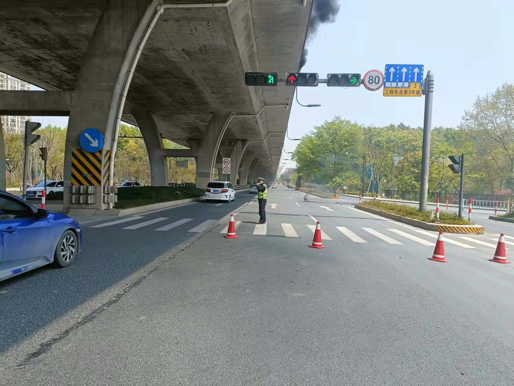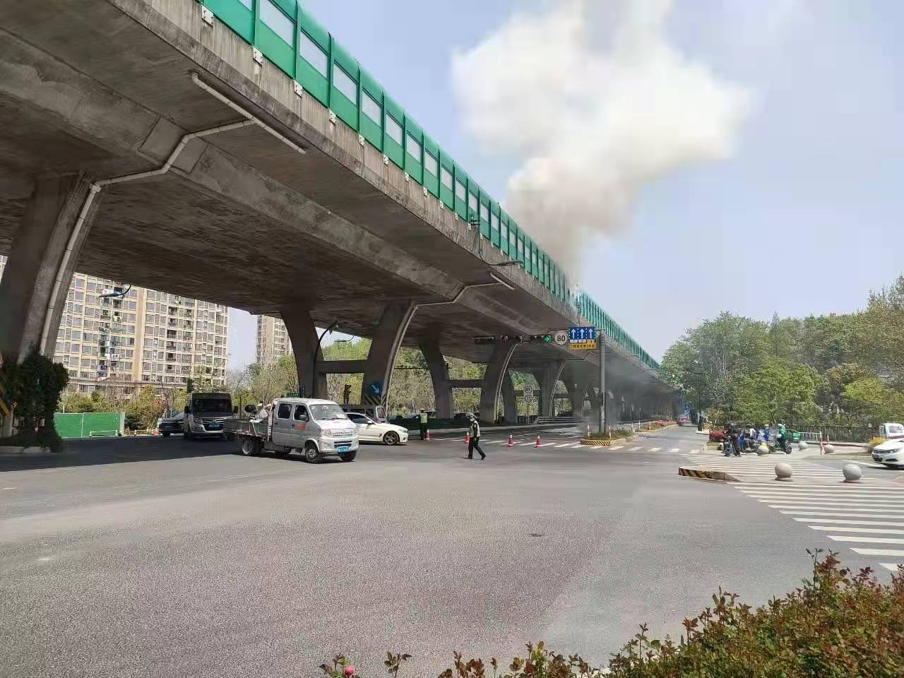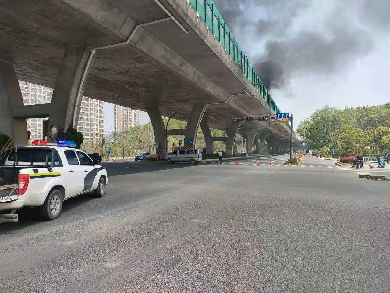 当几个人赶到高架桥下时,发现高速隔离板处有明火在燃烧,玻璃碎渣不时掉落下来,桥下情况十分危险。见此情形,冯奥立即将情况上报工作站值班领导,协助引导路面车辆避开绕行,安排同事封闭右转专用车道,避免过往车辆和行人受到伤害。
