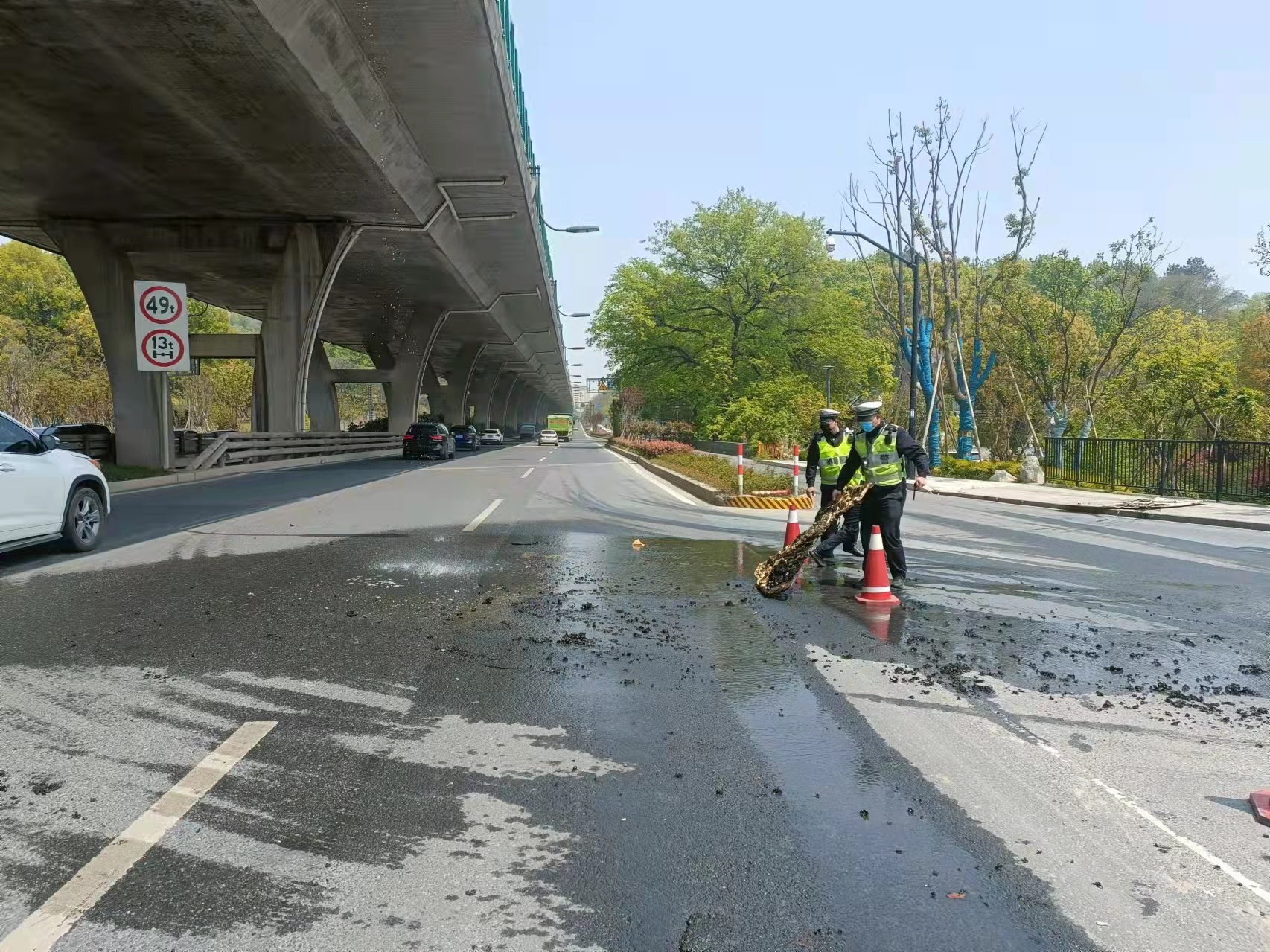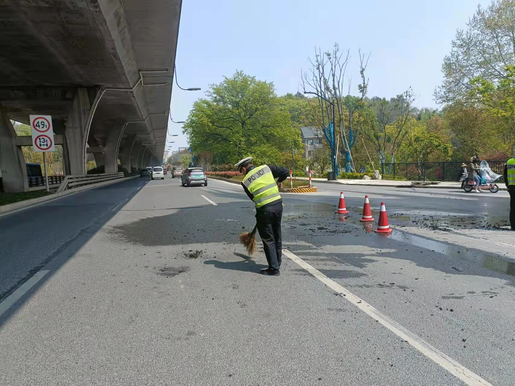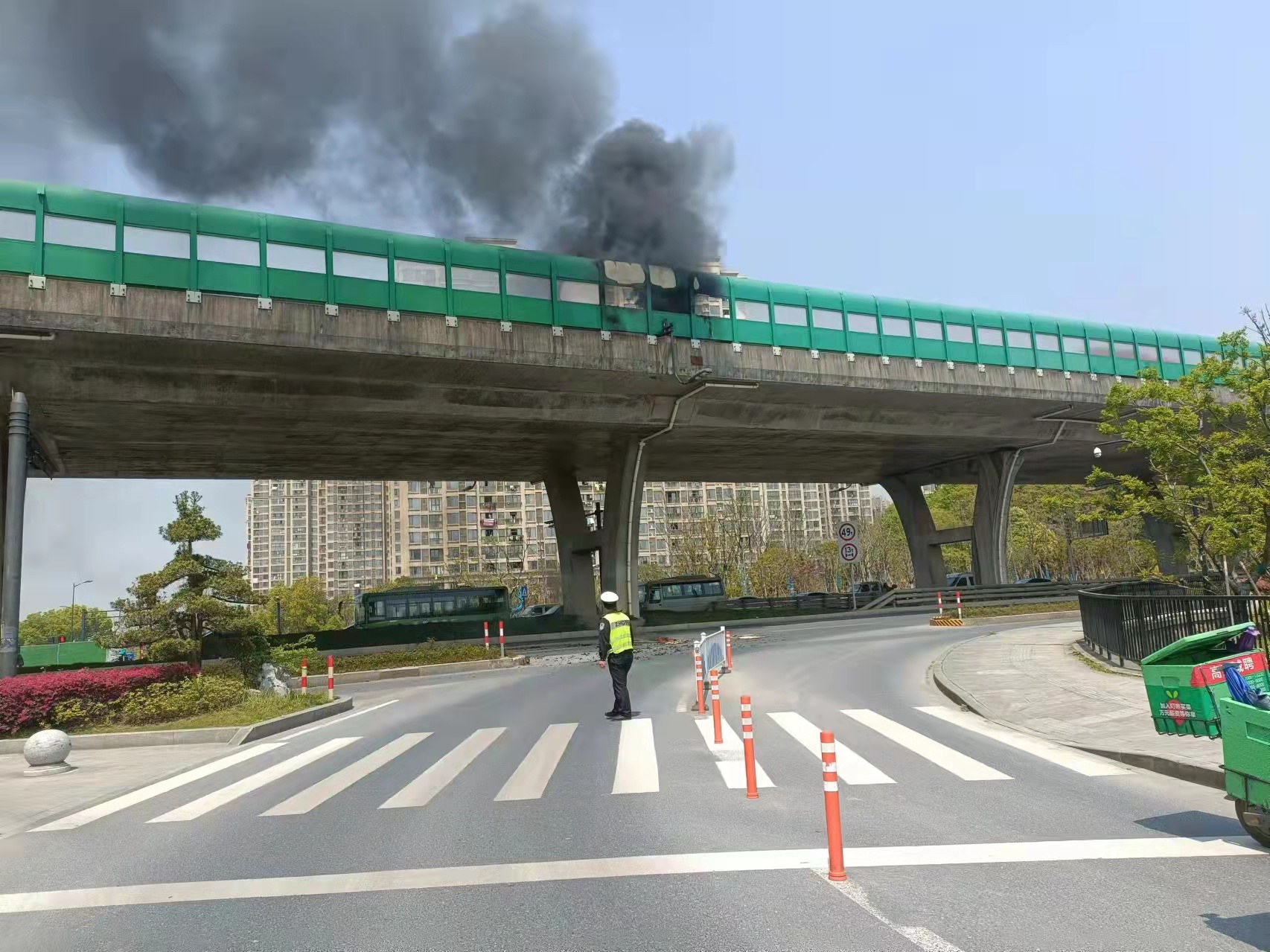 当几个人赶到高架桥下时,发现高速隔离板处有明火在燃烧,玻璃碎渣不时掉落下来,桥下情况十分危险。见此情形,冯奥立即将情况上报工作站值班领导,协助引导路面车辆避开绕行,安排同事封闭右转专用车道,避免过往车辆和行人受到伤害。