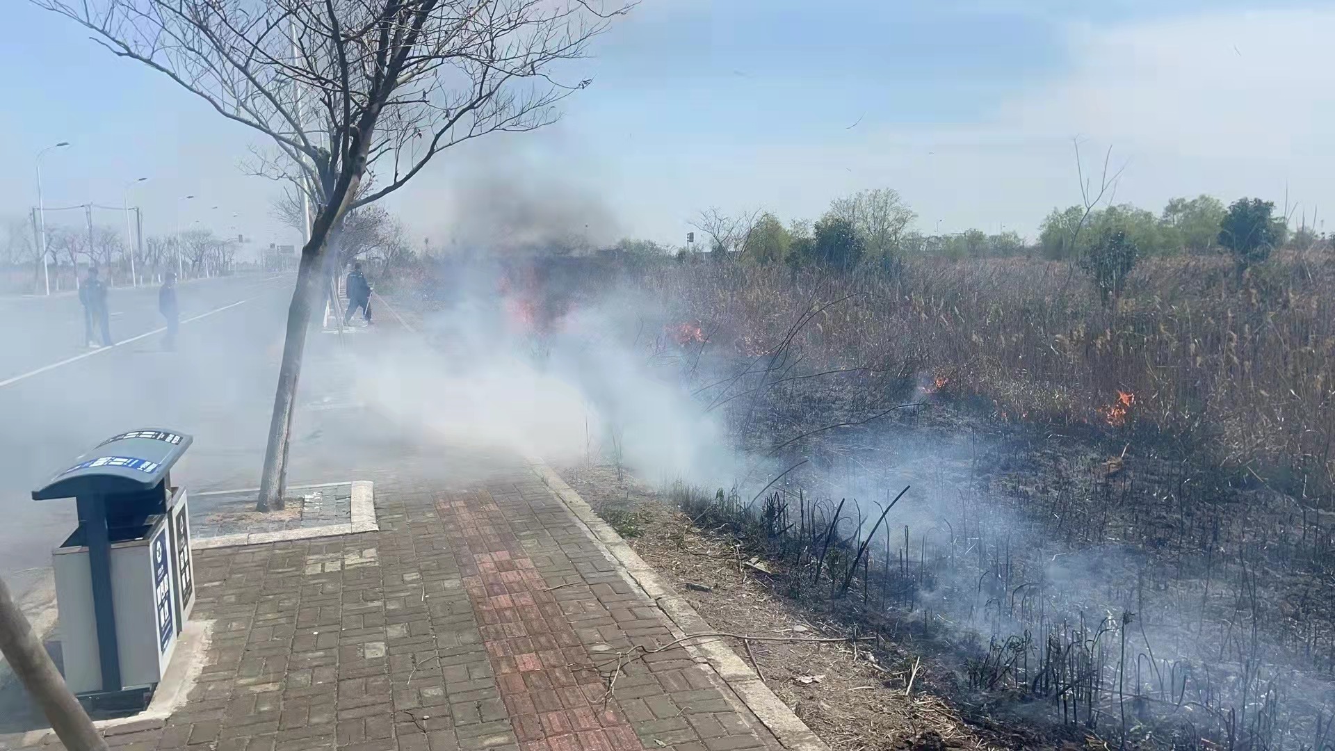 当日12:30,赵鹏和几位队员在环湖一路附近巡逻时,看到不远处的空地上有黑烟冒起,随即开着巡逻车前往查看,发现路边杂草起火。