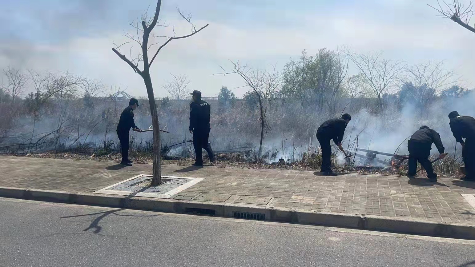 赵鹏立即安全地将车停在路边,几个人赶紧下车,拿起车上的铁锹,捡起路边的大树枝,进行灭火。同时为防止火势扩大蔓延,拨打了119火警电话,请求援助。