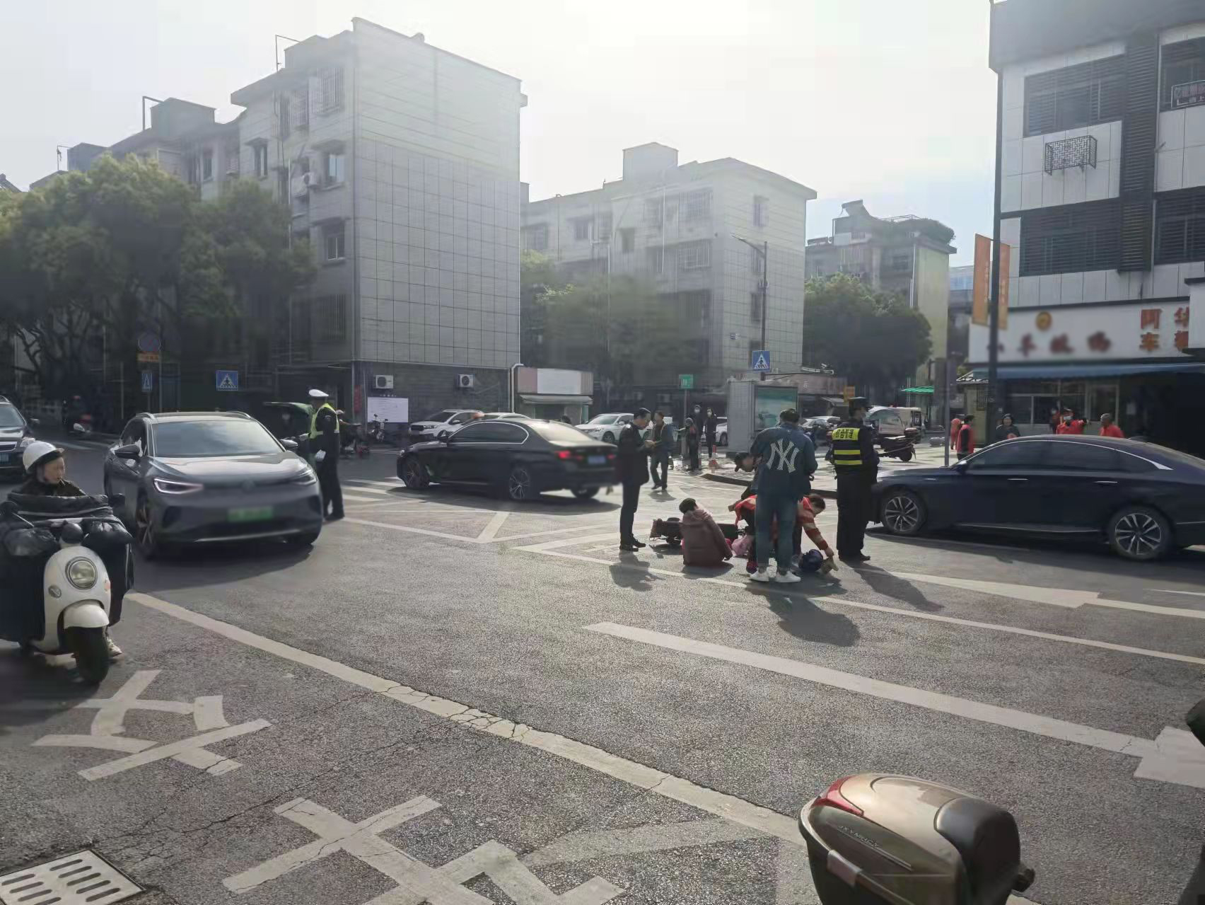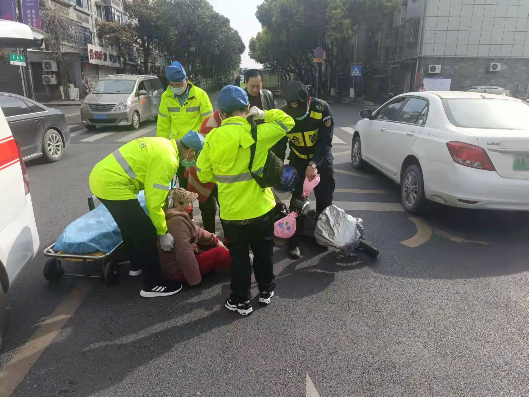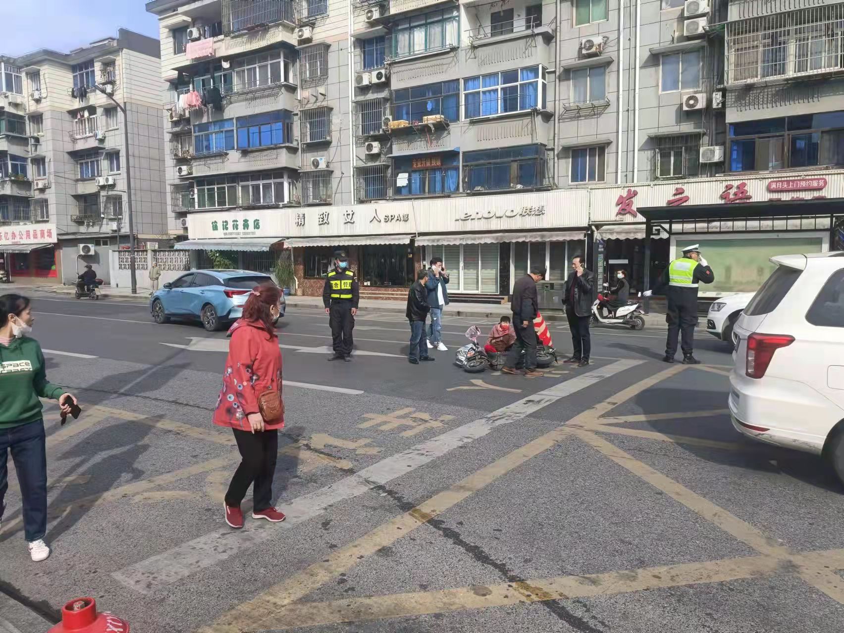 当天9:20,陈国清在文苑路文体中心附近巡逻时,看见前方不远处的路口发生了交通事故,便立即前往查看。原来是一辆轿车将骑电动车的阿姨撞倒在地,电动车倒在一旁,阿姨坐在地上。