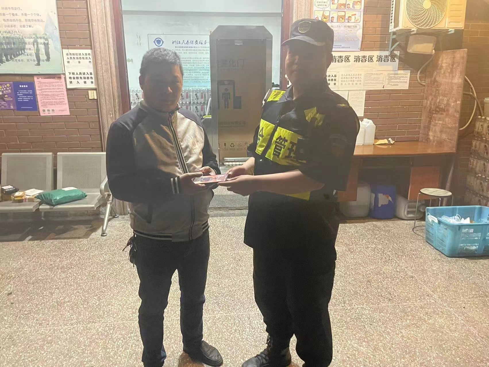 约过了半小时,一名男子骑着电瓶车赶到约定地点。雷川黔核实确认男子的失主身份后,将手机归还给了他,男子再三向队员雷川黔表示感谢。