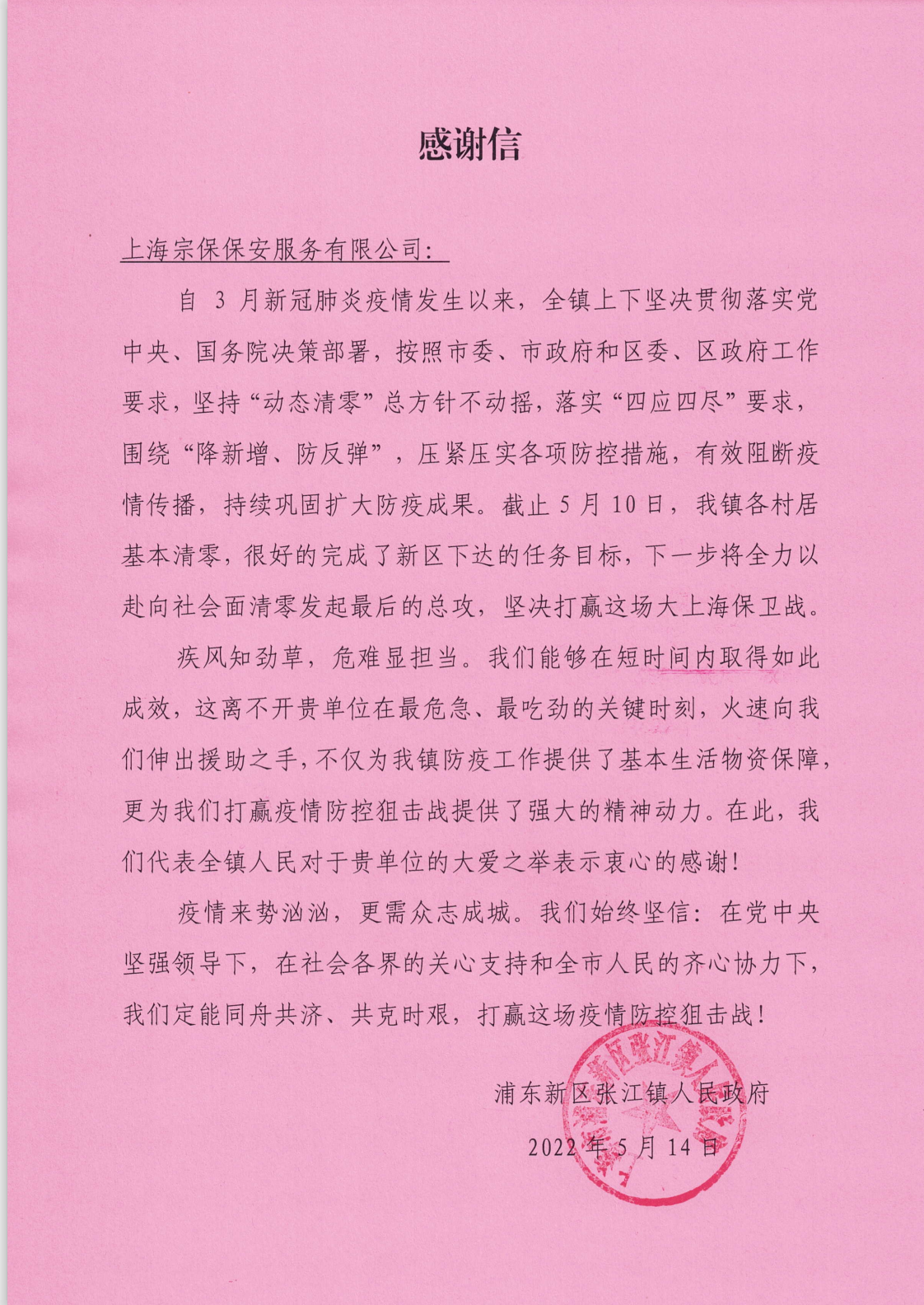 5月14日,宗保公司收到张江镇人民政府的感谢信,信中感谢公司对镇疫情防控工作提供的有力保障和所做的艰辛付出。