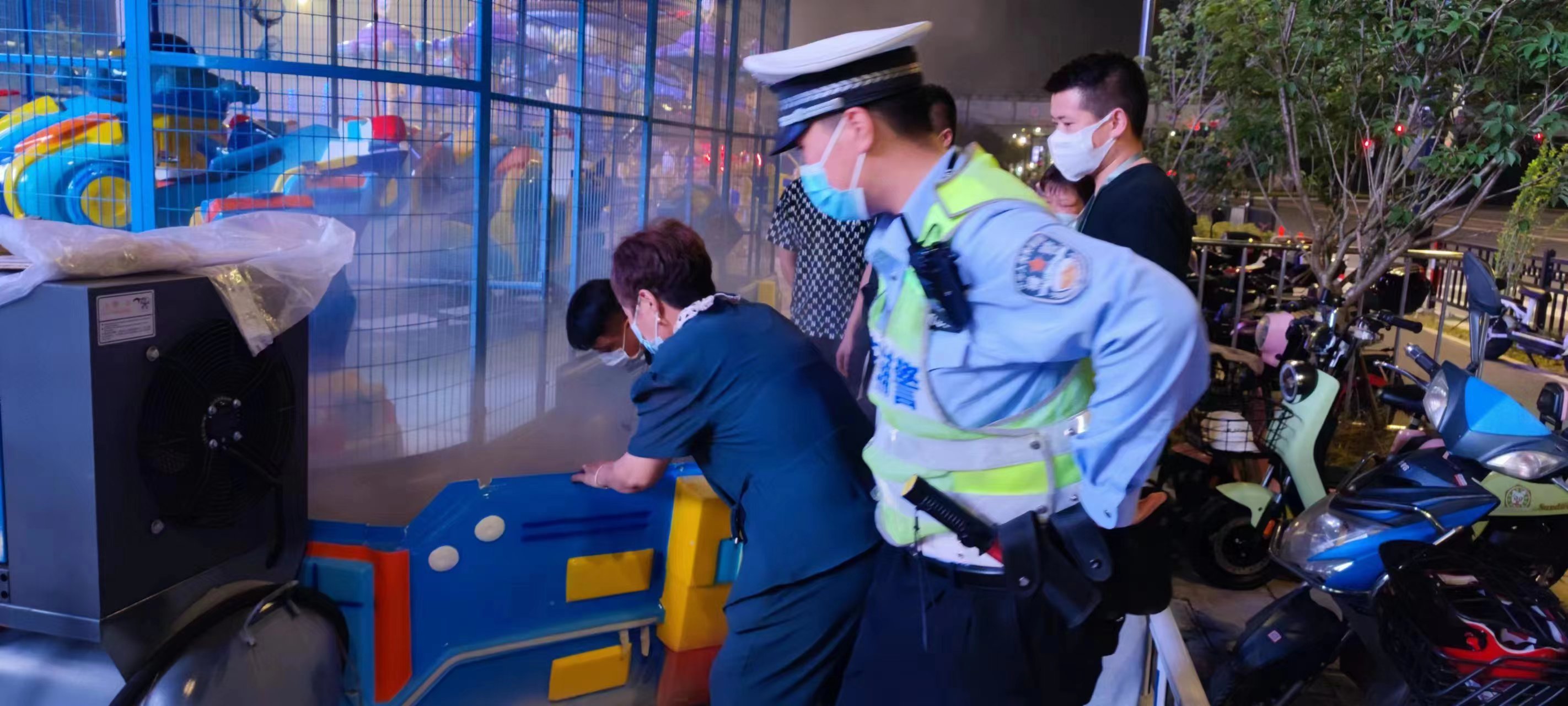 当日19:45,余安国和李家生在泥城万达广场1号口附近巡逻时,广场上一儿童娱乐设施出现故障,发现有浓烟从设备内部冒出。