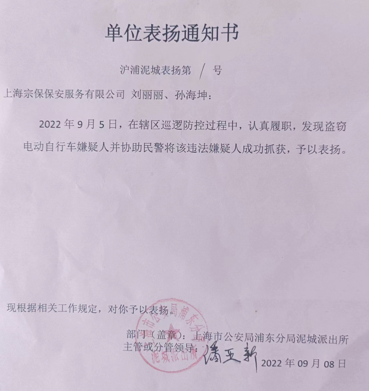 宗保公司员工刘丽丽和孙海坤工作中主动作为、细心警惕、认真负责的出色表现,得到了上海市公安局浦东分局泥城派出所的来信表扬。