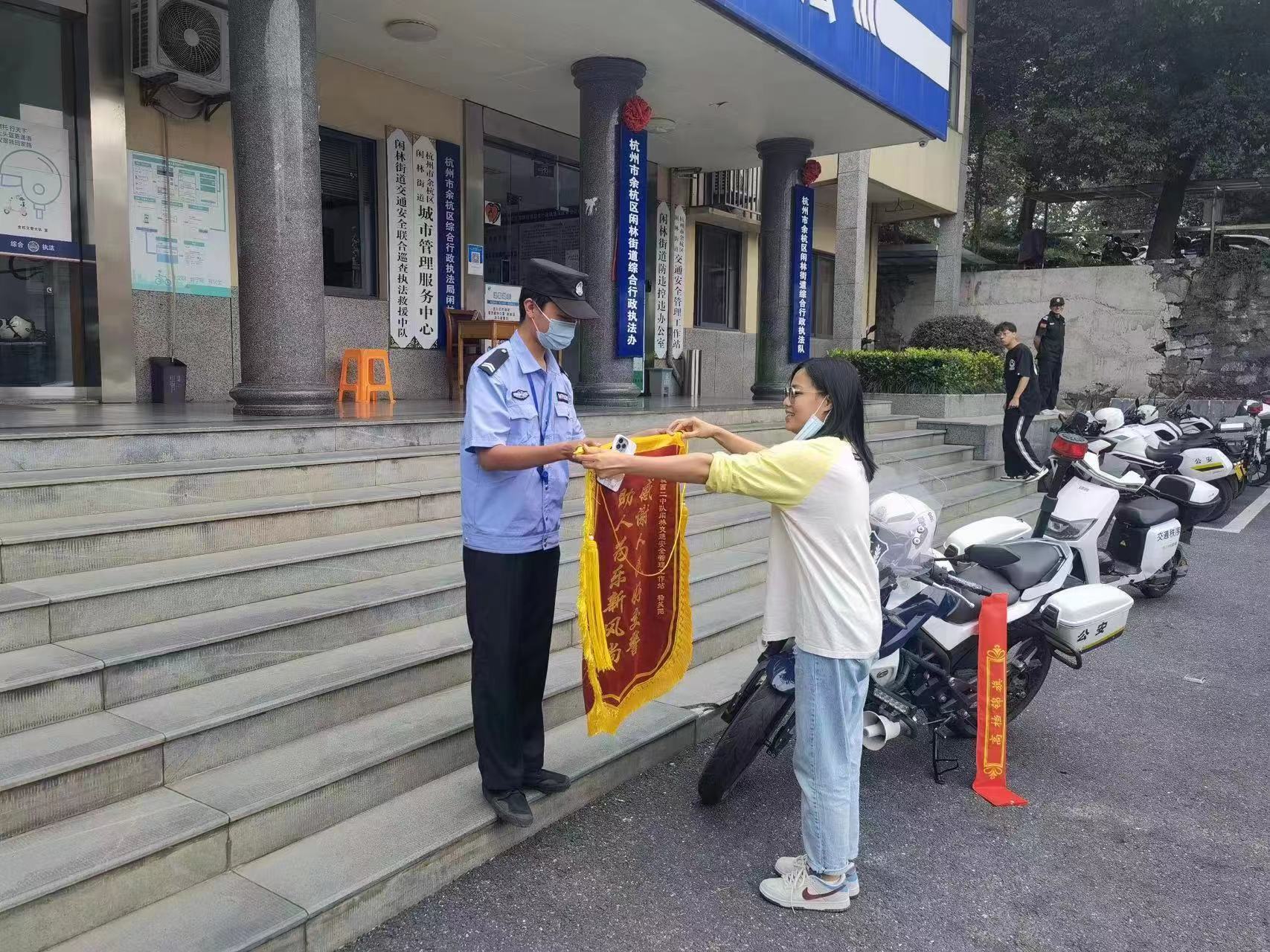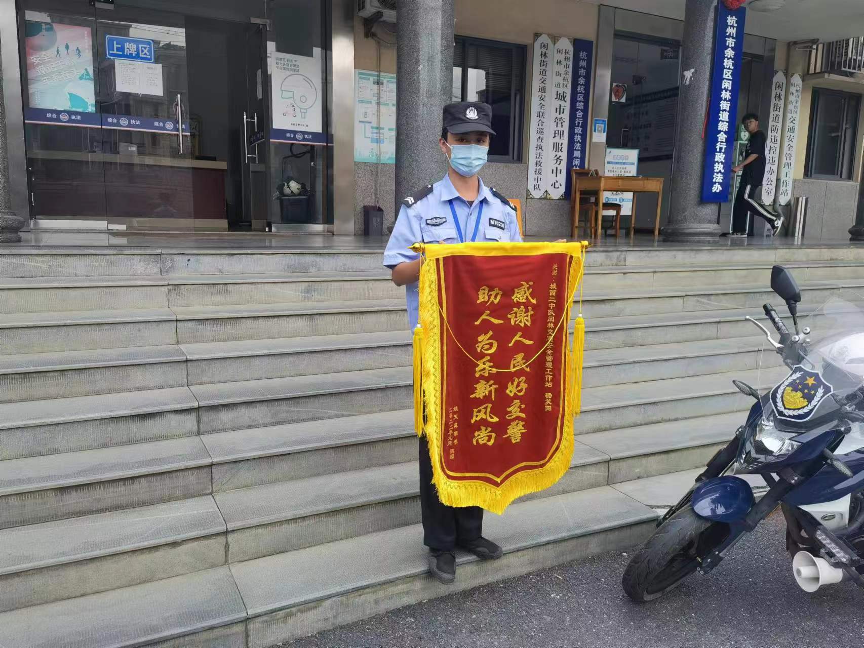 9月13日,浙江民泰公司驻杭州市余杭区闲林市容项目员工杨笑阳收到市民姚女士送来的一面绣有“感谢人民好交警 助人为乐新风尚”的锦旗,感谢他冒雨守护小学生的行为。