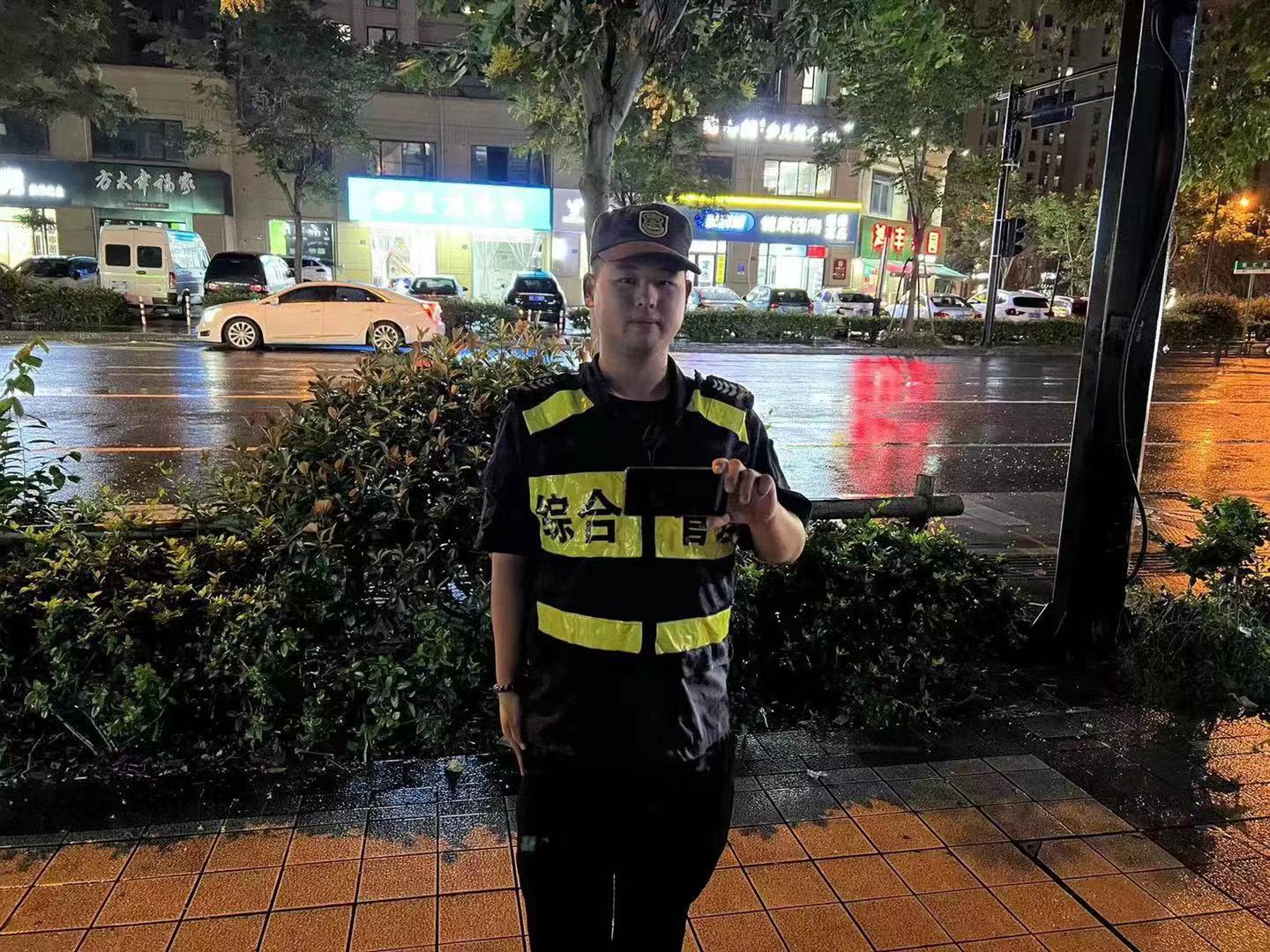 当天20:10,张彬洋在昆仑华府小区附近巡逻时,捡到一部红米手机。因手机设有锁屏密码,一时无法联系失主,便将情况上报项目负责人,并按指示在原地等待。