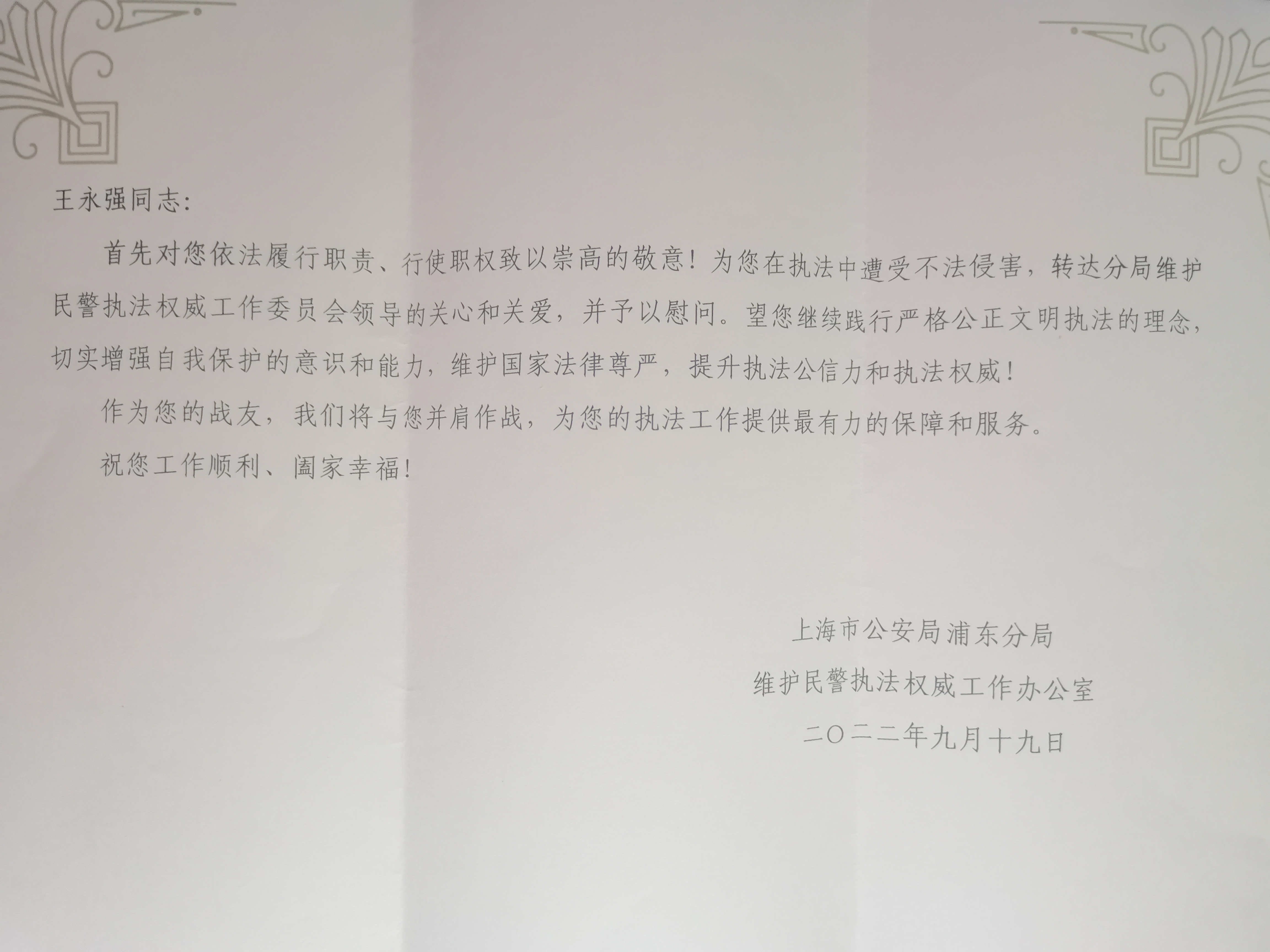 事后,王永强规范的执法行为、良好的心理素养、过硬的业务素质,得到了洋泾派出所领导的肯定,受到了上海市公安局浦东分局的来信表扬。