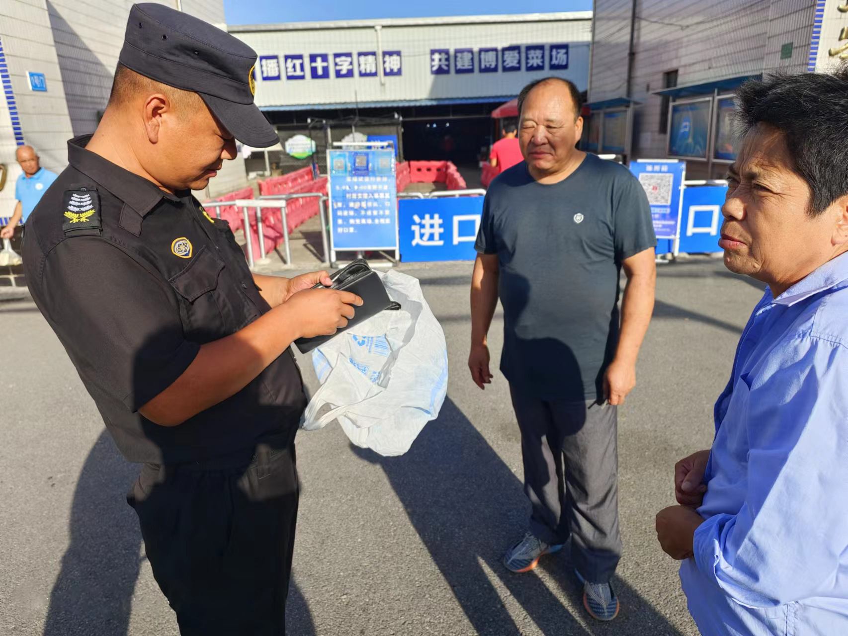 当日7:00,姜洪权在合兴菜市场巡逻时,捡到一个黑色小包,内有1100元现金、身份证、银行卡、一部苹果手机等物品。姜洪权第一时间便将捡到包的事情上报给项目负责人,并按指示在原地等候。