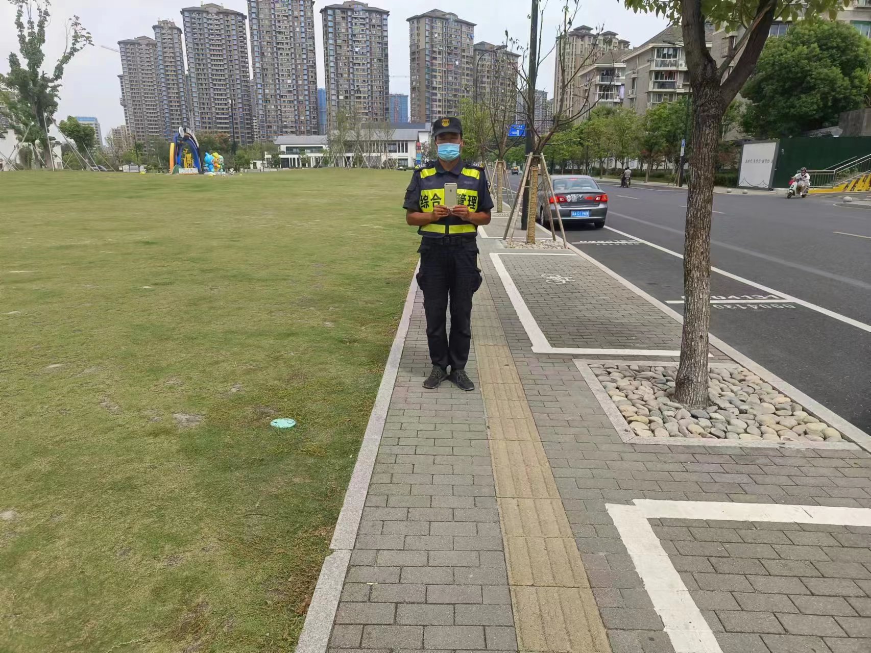 当日10:10,卢鹏在老街大草坪附近巡查时,捡到一部苹果手机,便立即上报项目组长,并按指示在原地等待。