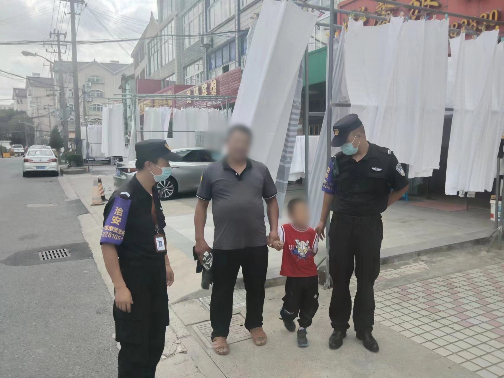 9月25日,宗保公司驻芦潮港派出所辅助项目员工帮助家长找到走散小男孩。