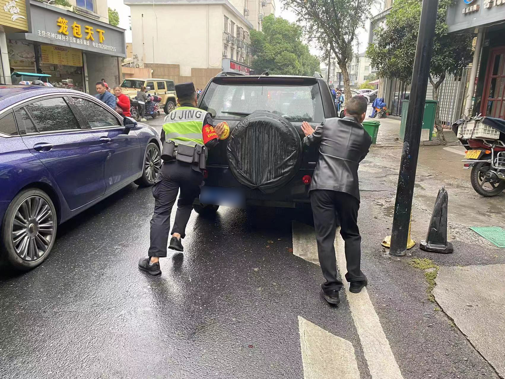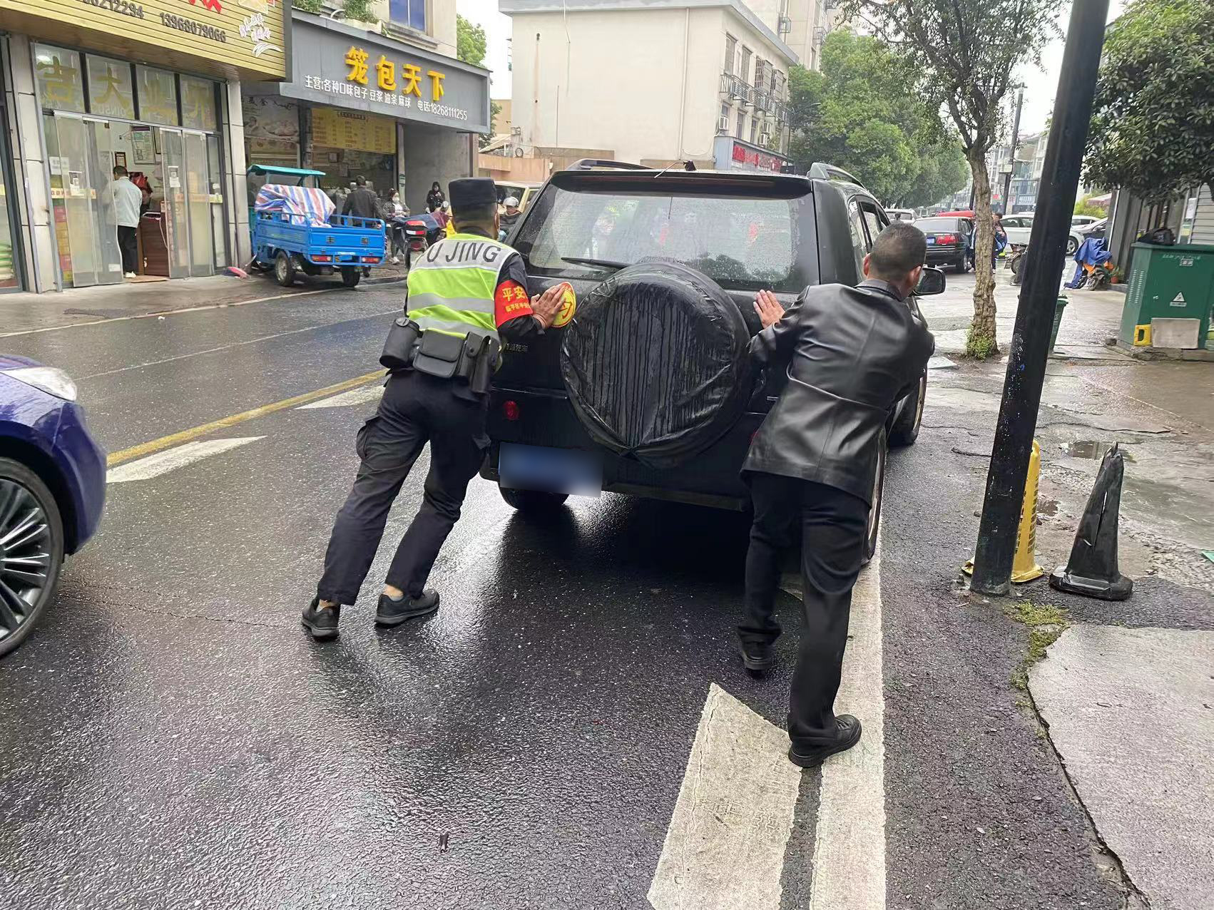 王一飞见此情景赶紧上前,原来轿车行至实验小学门口时,突然熄火无法正常行驶。了解情况后,王一飞主动提出可以帮忙。随即,两人合力将轿车推到路边安全地带。