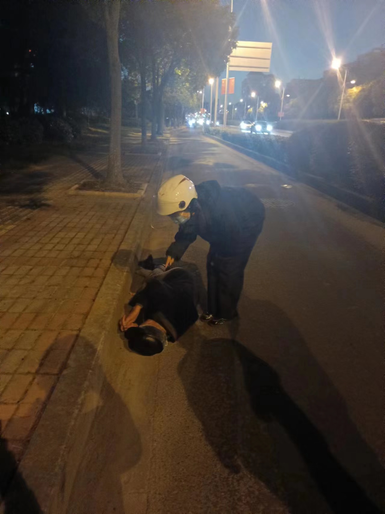 当天17:00,公司员工柏会娟下班途经周祝公路芙蓉花路时,看到一位老人躺在非机动车道上,来往骑行的非机动车较多,天色已黑,光线暗淡,容易发生事故,比较危险。