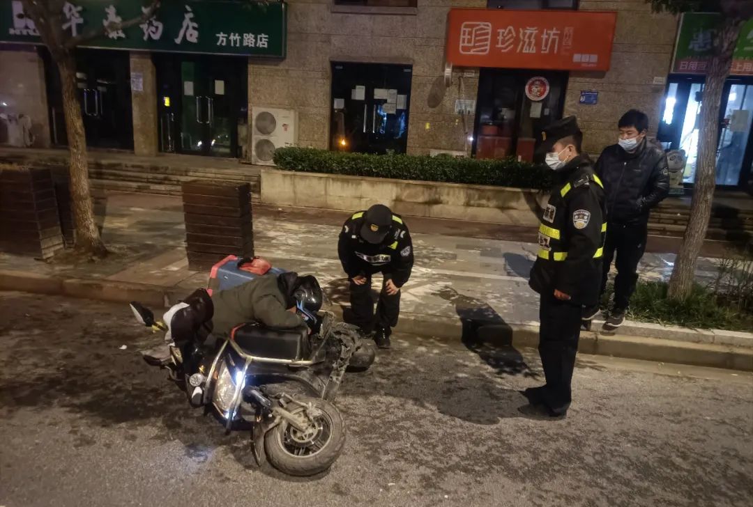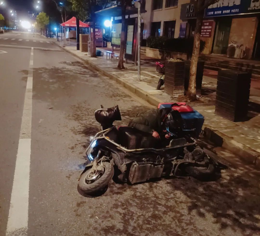 当日凌晨2:30,公司员工李汉涛、李文明和刘润在方竹路789弄小区附近巡逻时,看到一男子趴在一辆倒地的电瓶车上,就赶紧上前察看。
