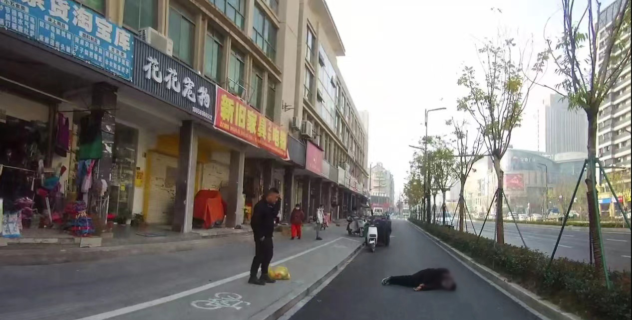 当日10:30,公司员工杨杰和汪超巡逻至良渚街道金昌路铭雅苑附近时,遇到一路人求助,称非机动车道上有一个男子躺倒在地上,不知道怎么回事。