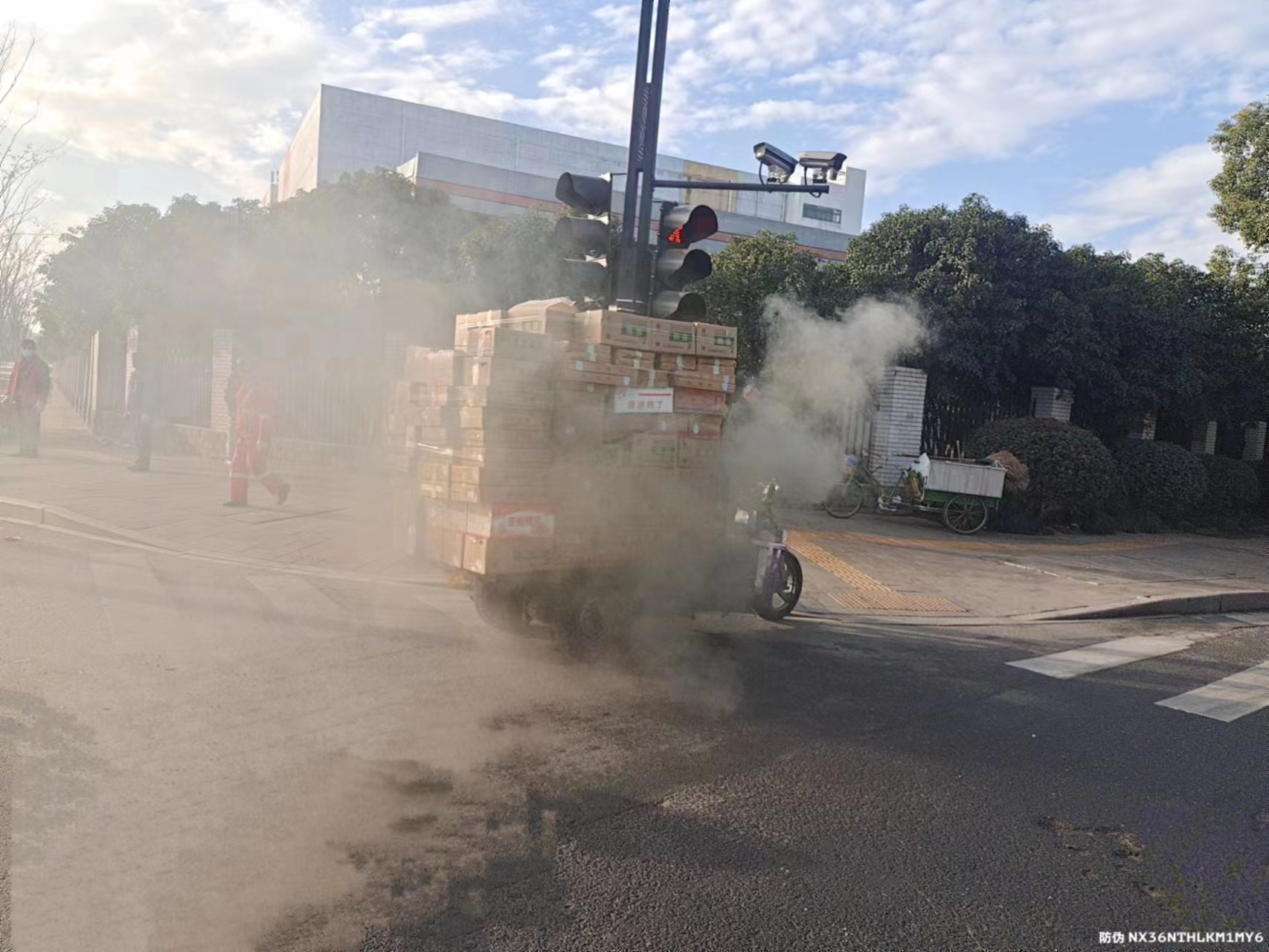 当日8:00,公司员工宁晨龙在良渚物港港虹西路与储运路口巡逻时,突然发现路边一辆满载货物的三轮车冒着浓烟,站在一旁的车主显得手足无措。